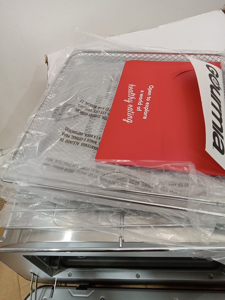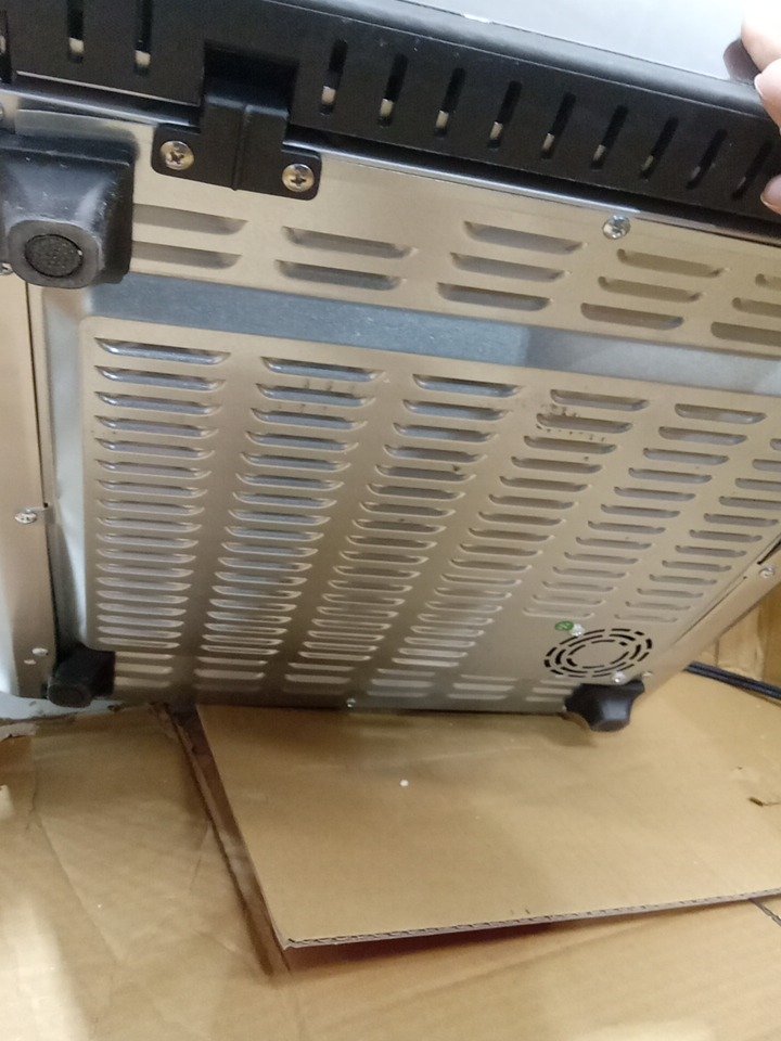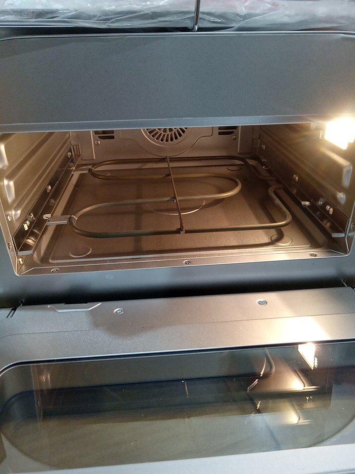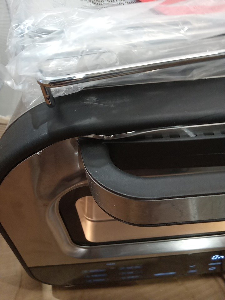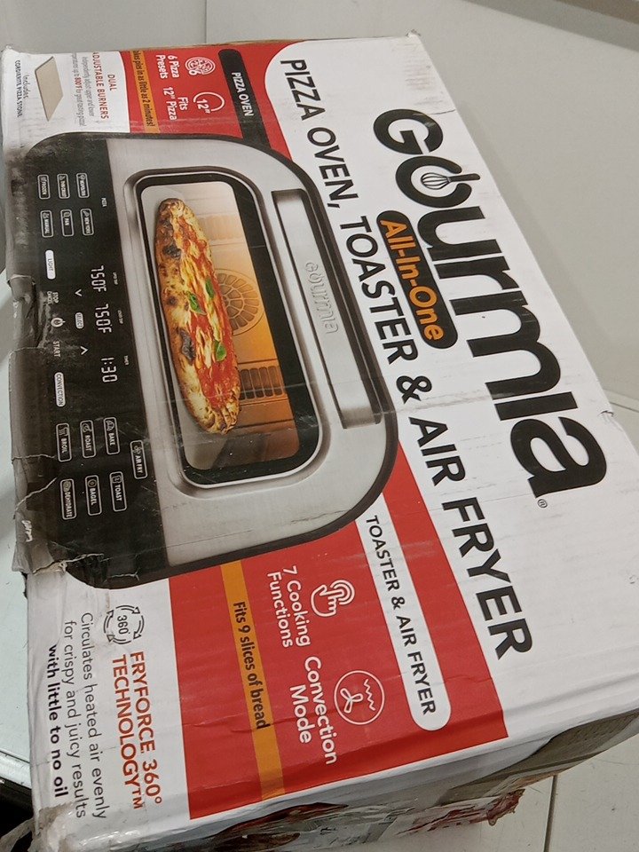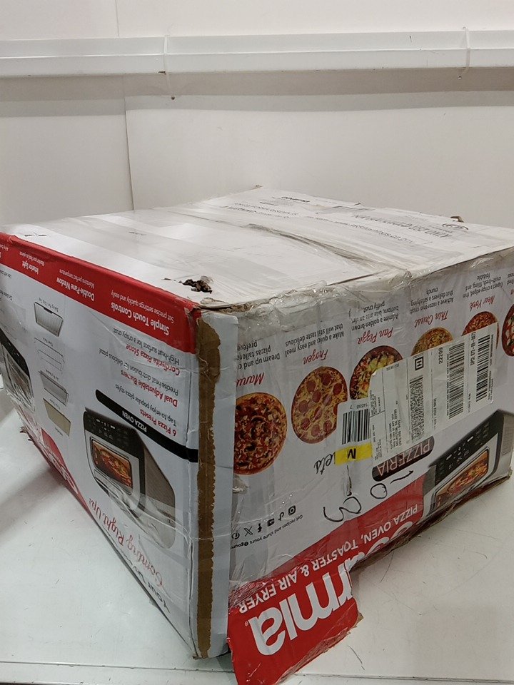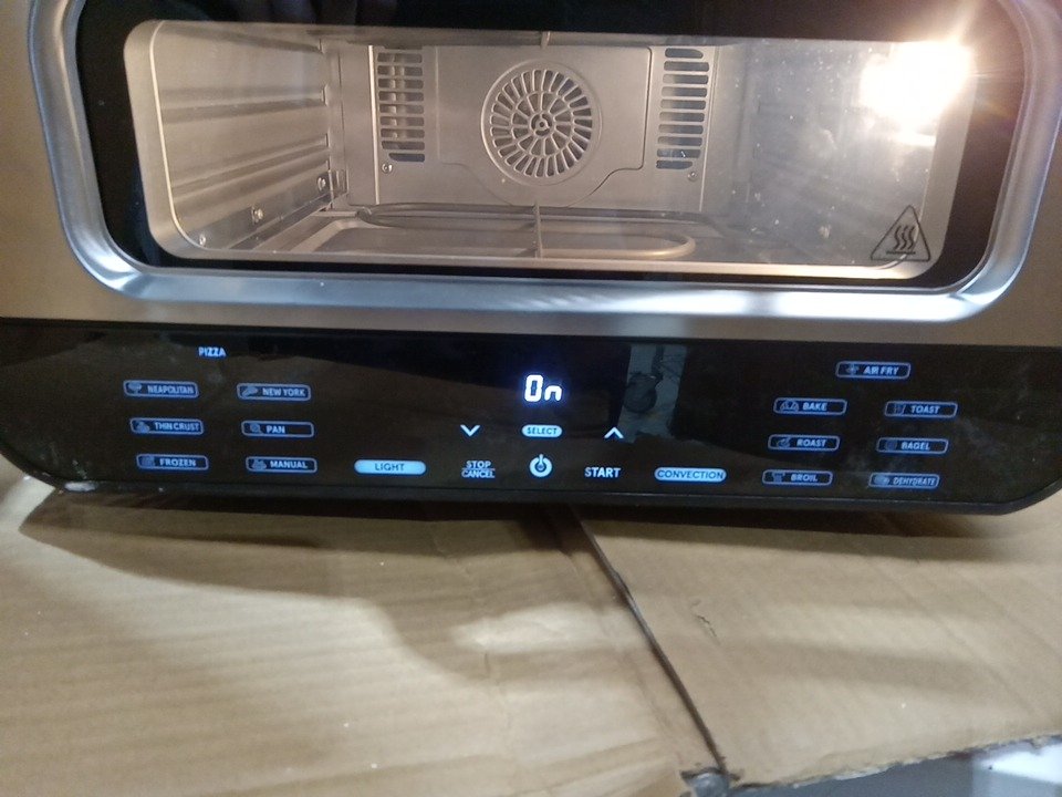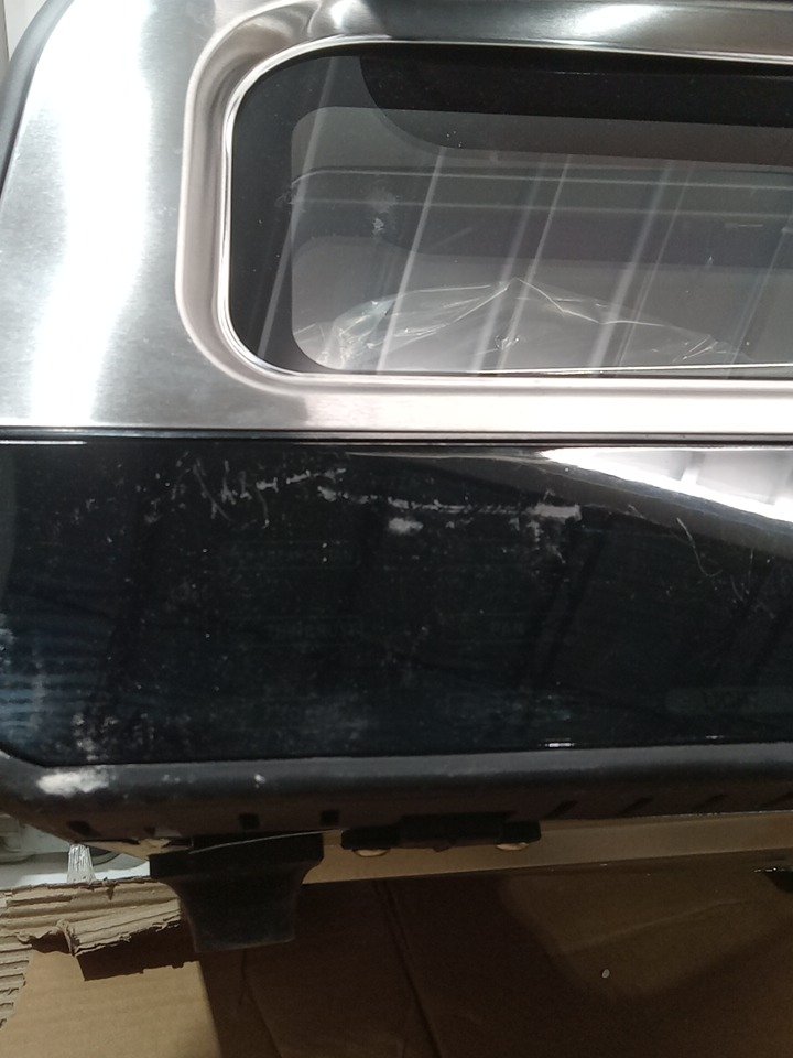 The bottom legs are dented, the front door is slightly dented. Dirt on the front door, likely from shipping/handling as the box is very distressed. Tested for power only. Missing the pizza stone.