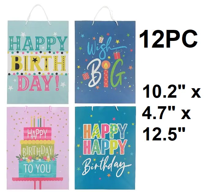 12pc assorted birthday gift bags - 10.2" x 4.7" x 12.5" - Multicolour