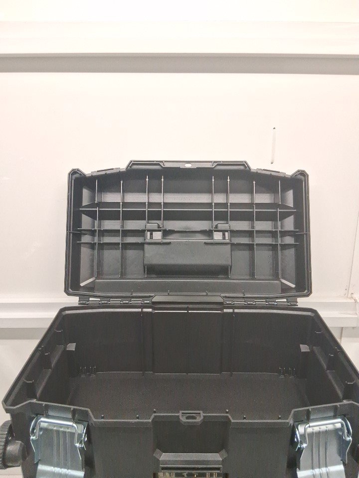 There is a minor crack on the right side near the middle compartment edge. There might be dust on the wheels due to warehouse inspection. (Please see photos)