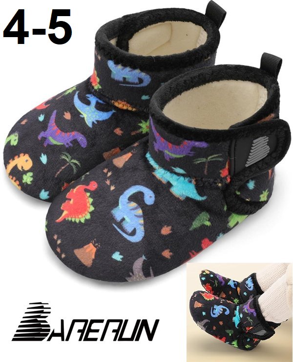 UNISEX BARERUN Toddler Plush Cozy House Slippers/Shoes, Warm Lightweight nonslip rubber sole - size 4-5 (20-21) - black/dinosaurs