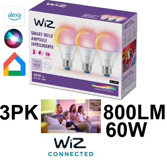 3PK WiZ A19 Smart led light bulbs, connects to Wi-Fi and works with Google, Alexa, and Siri - ā€Ž60W/800LM - Multicolor/WARM-COOL (Model:ā€Ž605250)