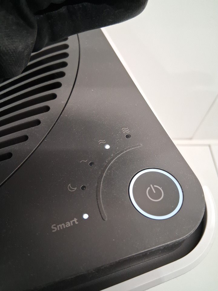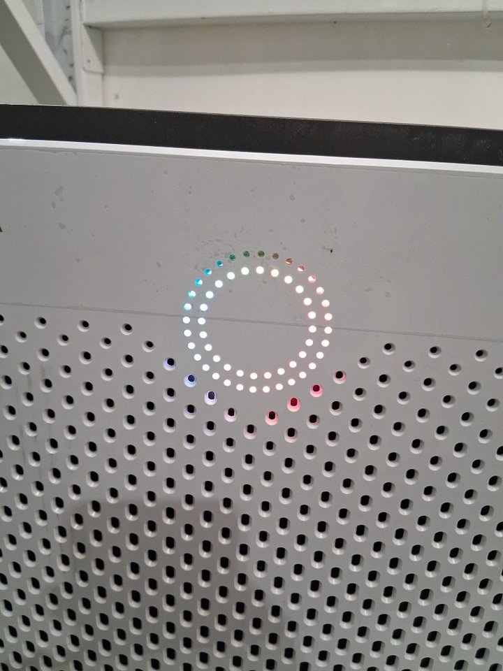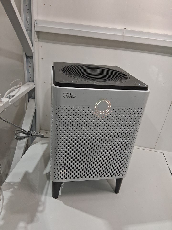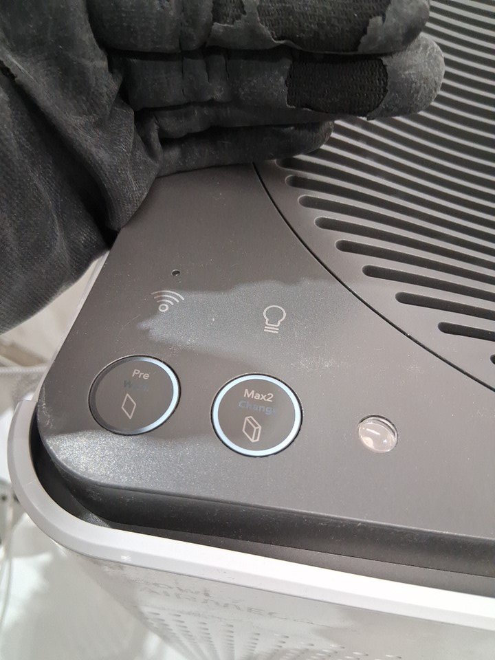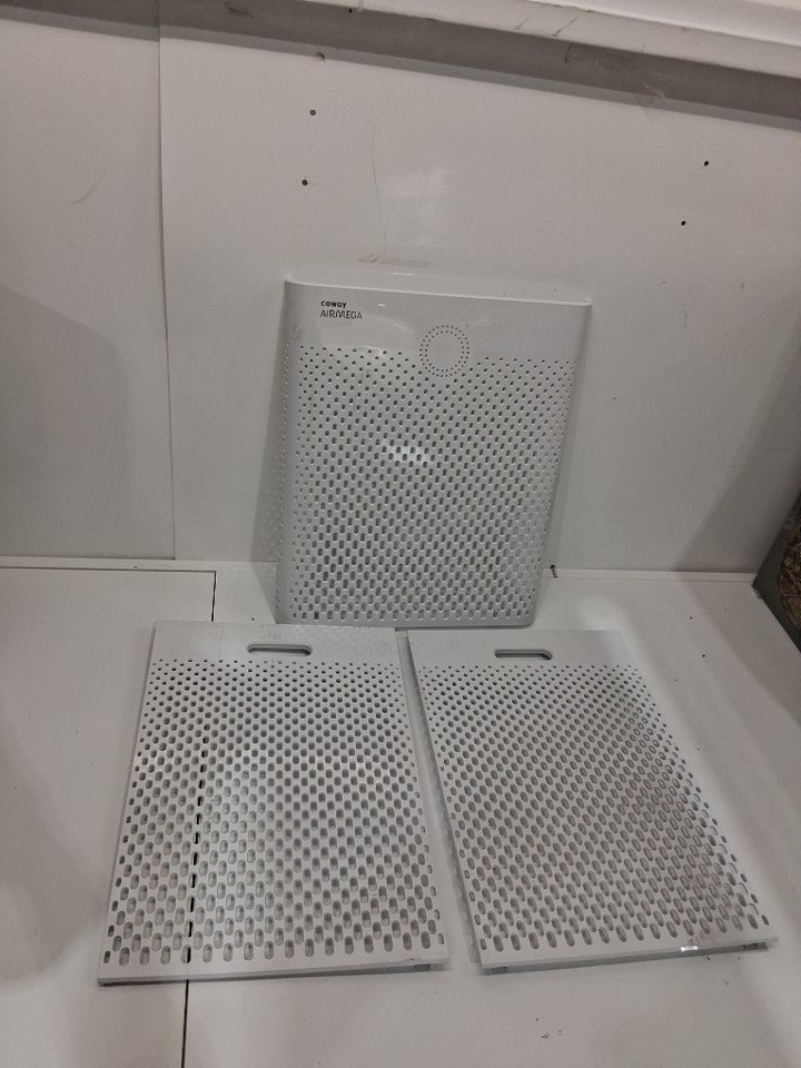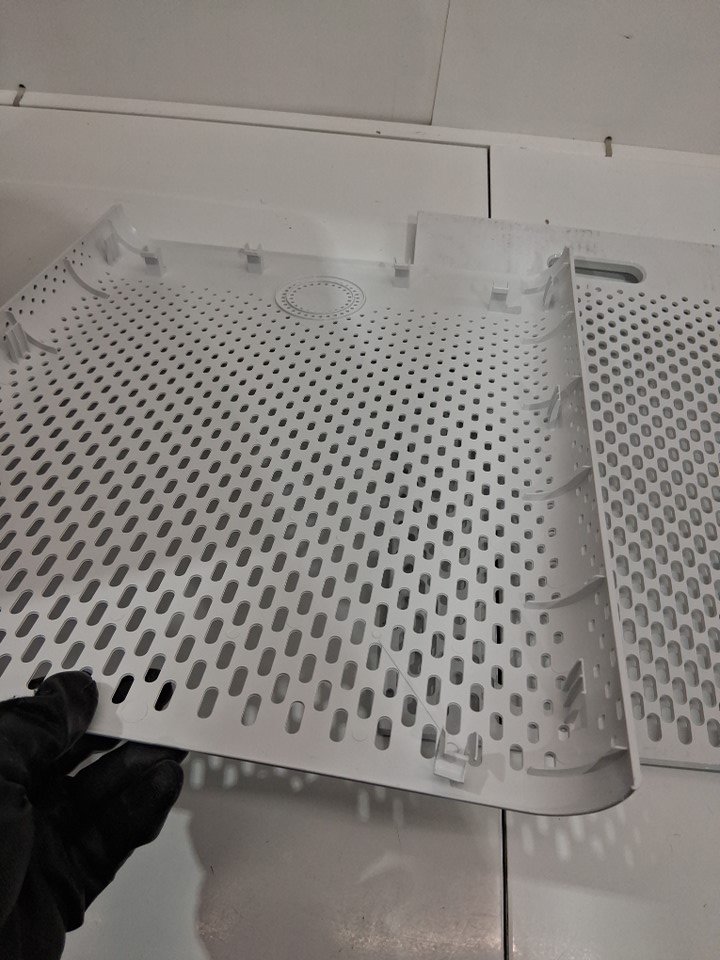 Lightly dusty from use Left side plastic cover has a bottom peg missing but still clips on fine, and front panel has some light bending/warping with two of its pegs but we were able to attach it, though a little loose. Tested for power