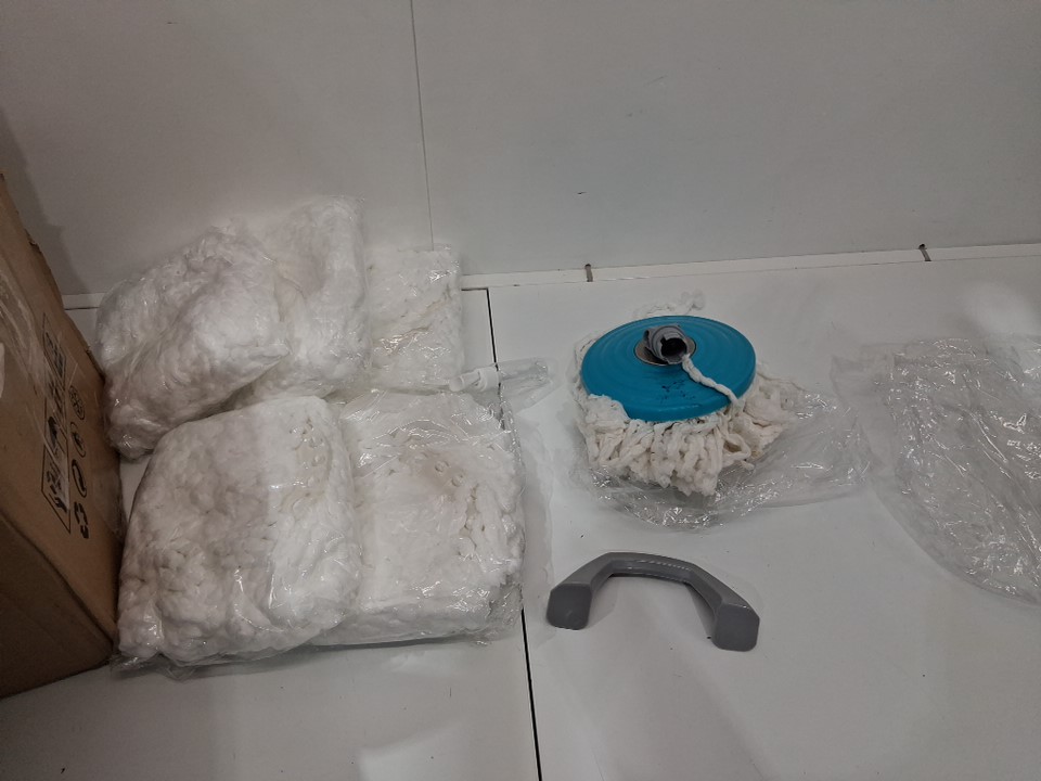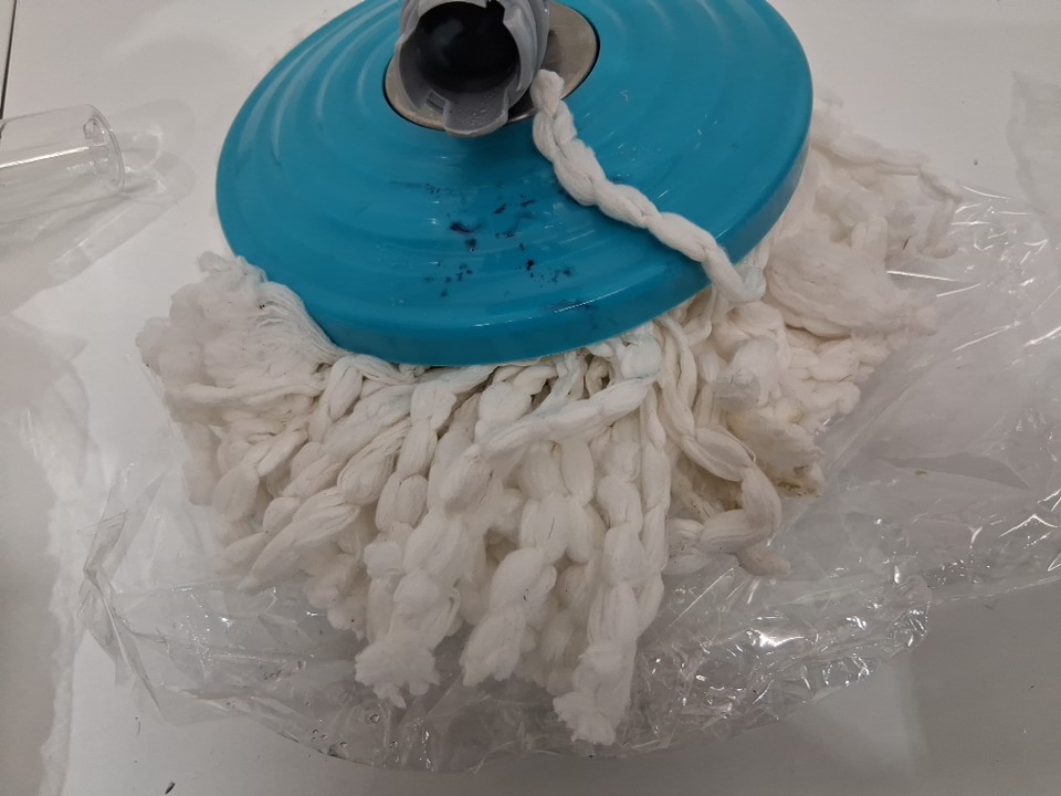 Missing one of the extra mop heads, currently installed mop head is dirty, but there are still 5 brand new spares.
