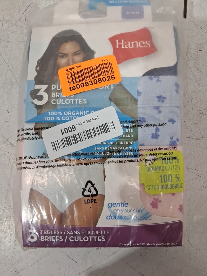3PK Womens HANES tagless Pure Comfort 100% Organic Cotton Briefs - SIZE 6 / MEDIUM - assorted