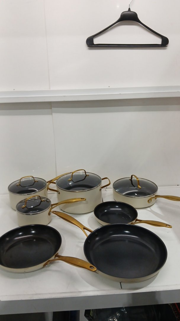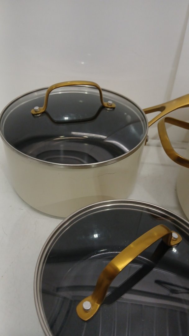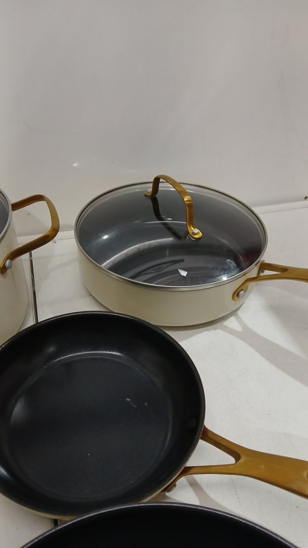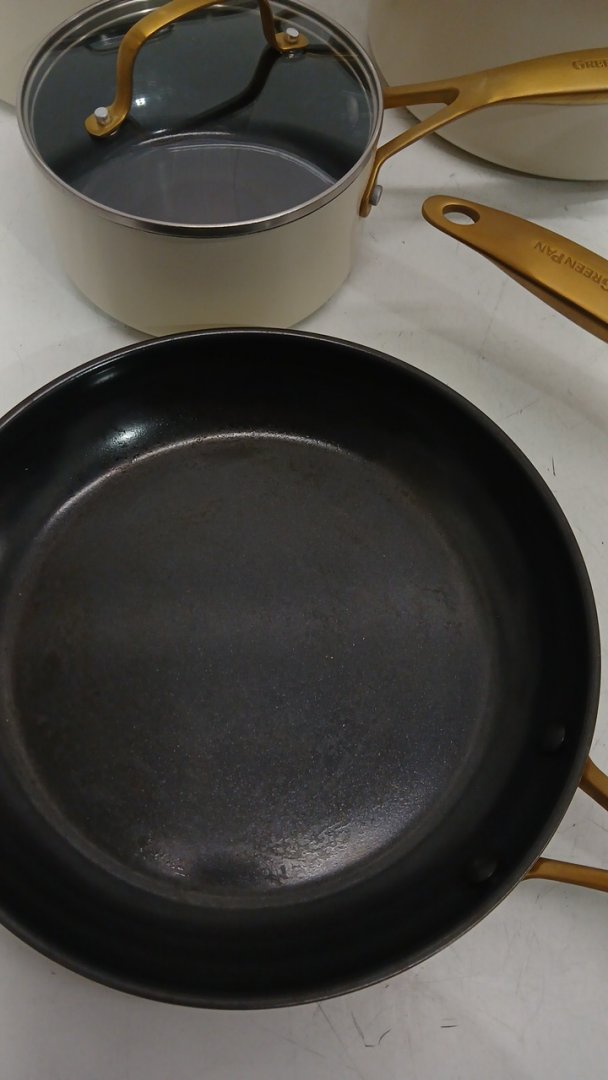 3 of the pans have grease/food residue from previous use but the rest are new, minor cosmetic markings on the exterior, see photos