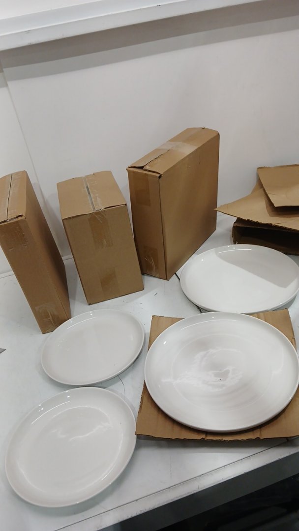 2 out of the 4 boxes are sealed, one large plate has a very tiny chip, see photos