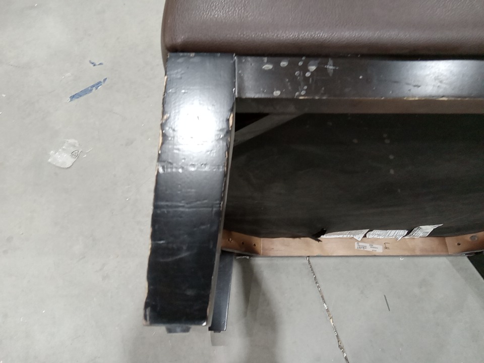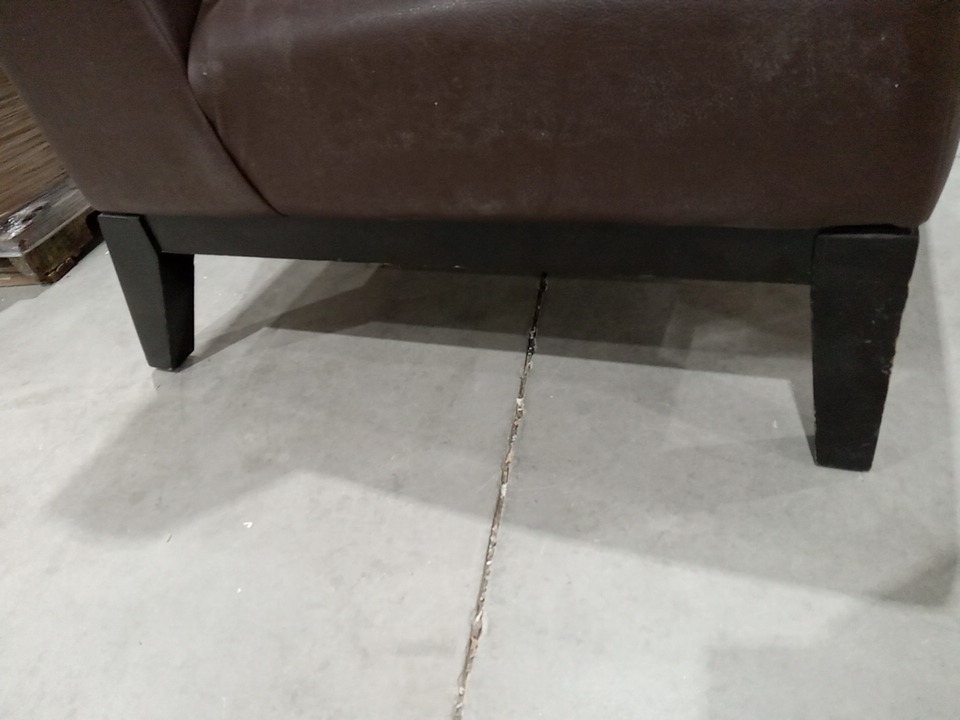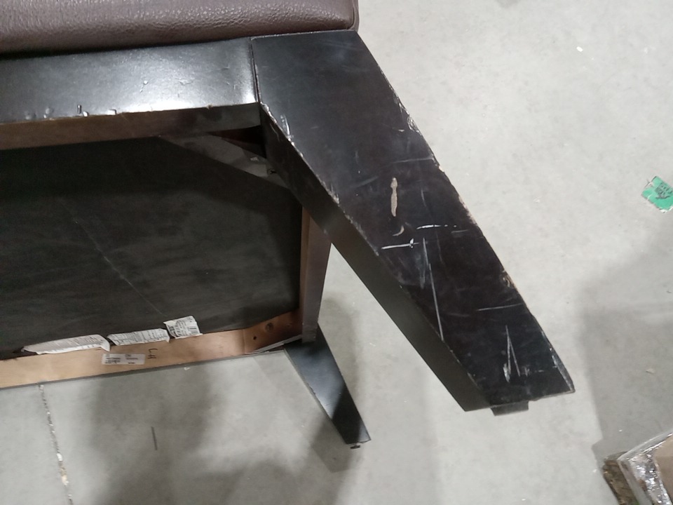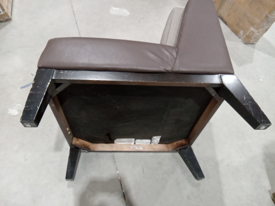 Keep in mind that the seat seen in the main image is only similar to this item and does not look exactly the same physically, the one in the main image is pure white and has arms where as this item is brown with a grey cushion and is armless , their is some scratches / scuffs on the wood legs of this item and some fraying on the leather, this is due to prior heavy use, see photos below.