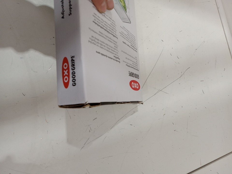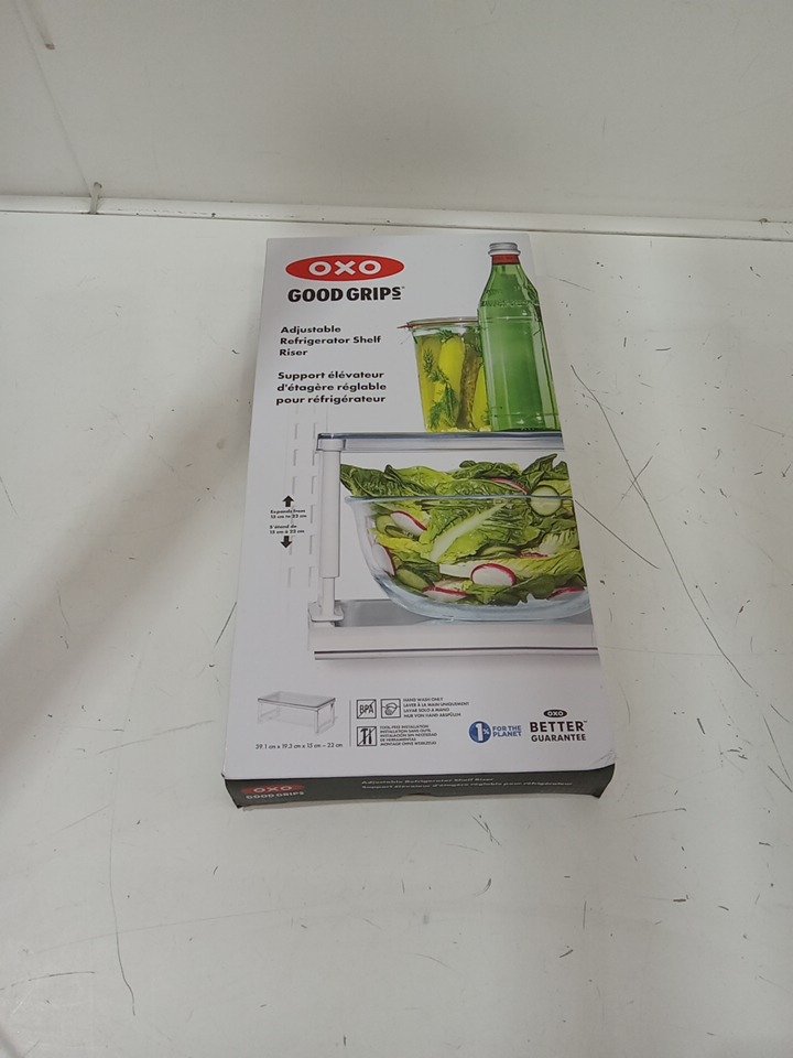 oxo good grips adjustable fridge shelf riser - 15.4" x 7.6" x 5.9" to 8.6" - clear/white (model: ‎13347000)