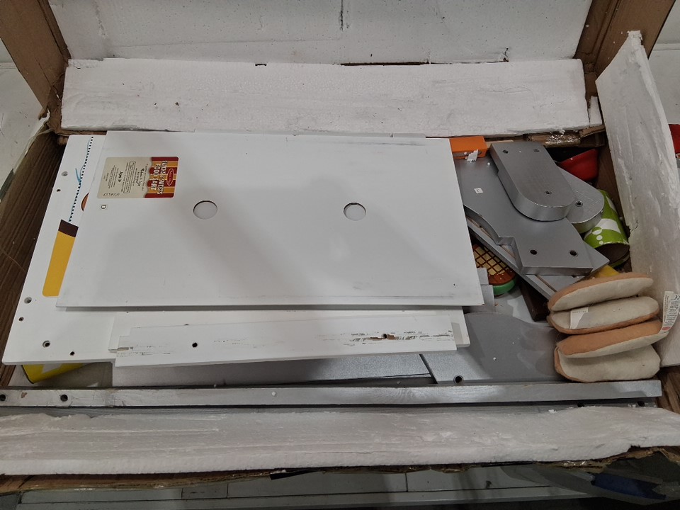 There are numerous scuffs, chips, and stains on many pieces indicating prior use - see photos. Aside from these cosmetic issues, there appears to be no major damage to any part that would interfere with assembly or use, and all parts appear present. However, some assembly hardware may have gone missing during repacking and shipping, so customer may need to provide their own hardware in order to complete assembly.
