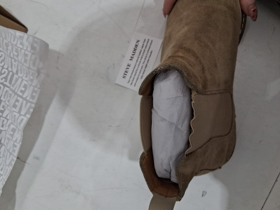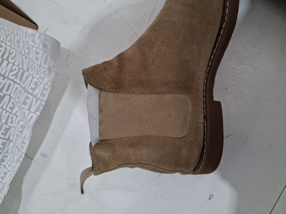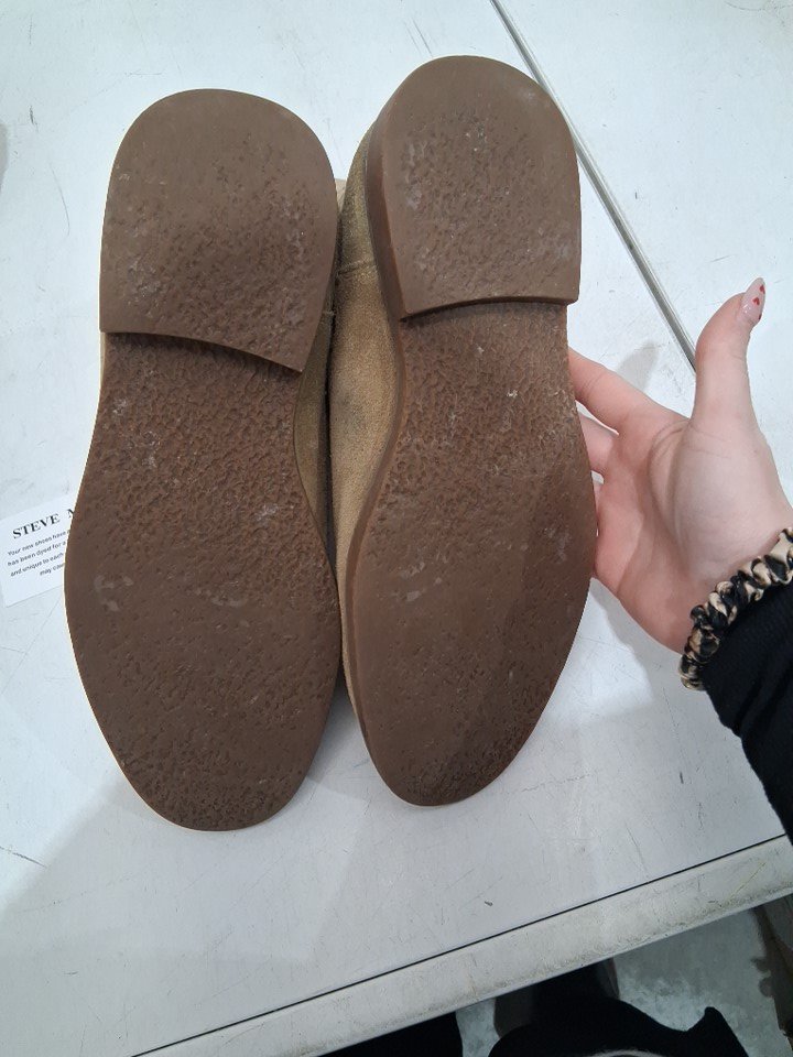 slack in the ankle elastic and worn-down parts on the soles show signs of previous use.