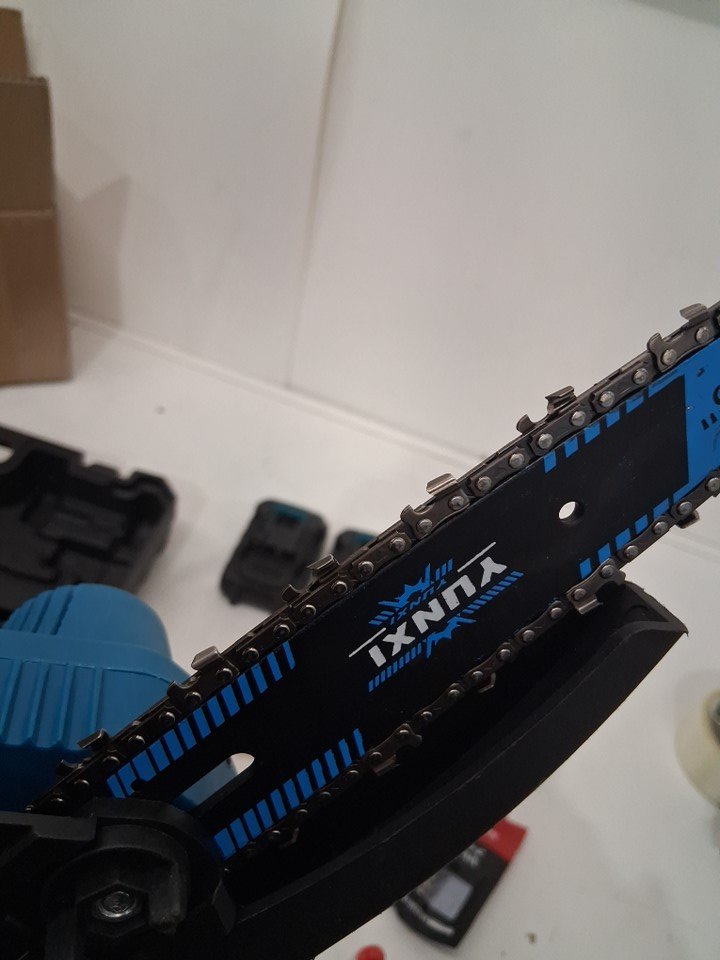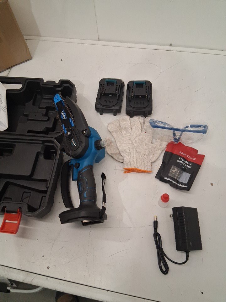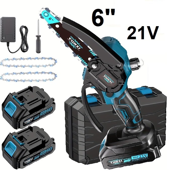 yunxi handheld mini electric chainsaw with 2 batteries & extra chains- 6"/21v- black/blue (model: cs6010)