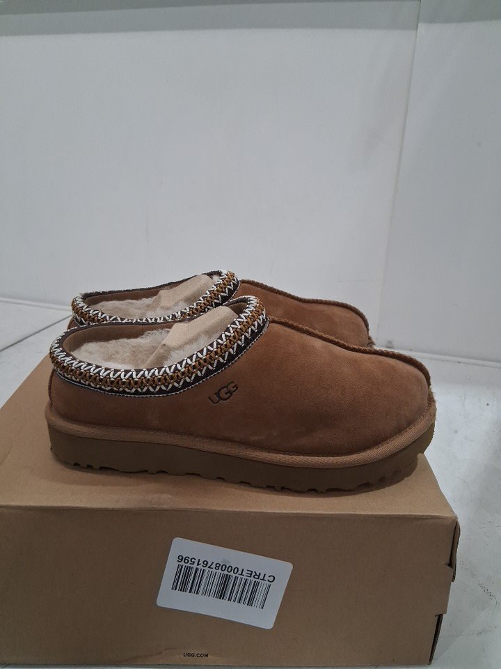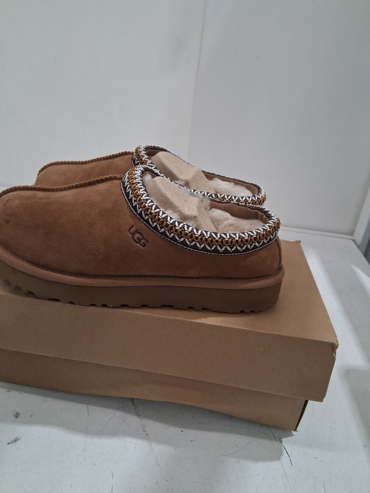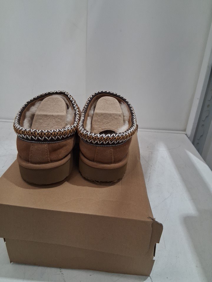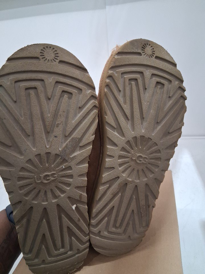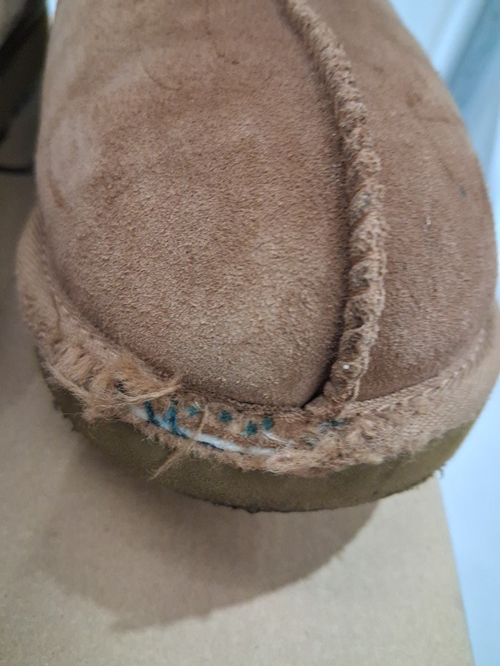 The item's right shoe has a tear on the front and a small stain. The heel of the shoe shows signs of prior use; see photos for details.