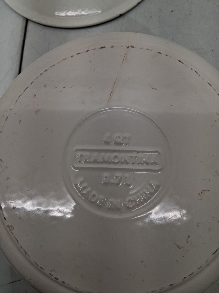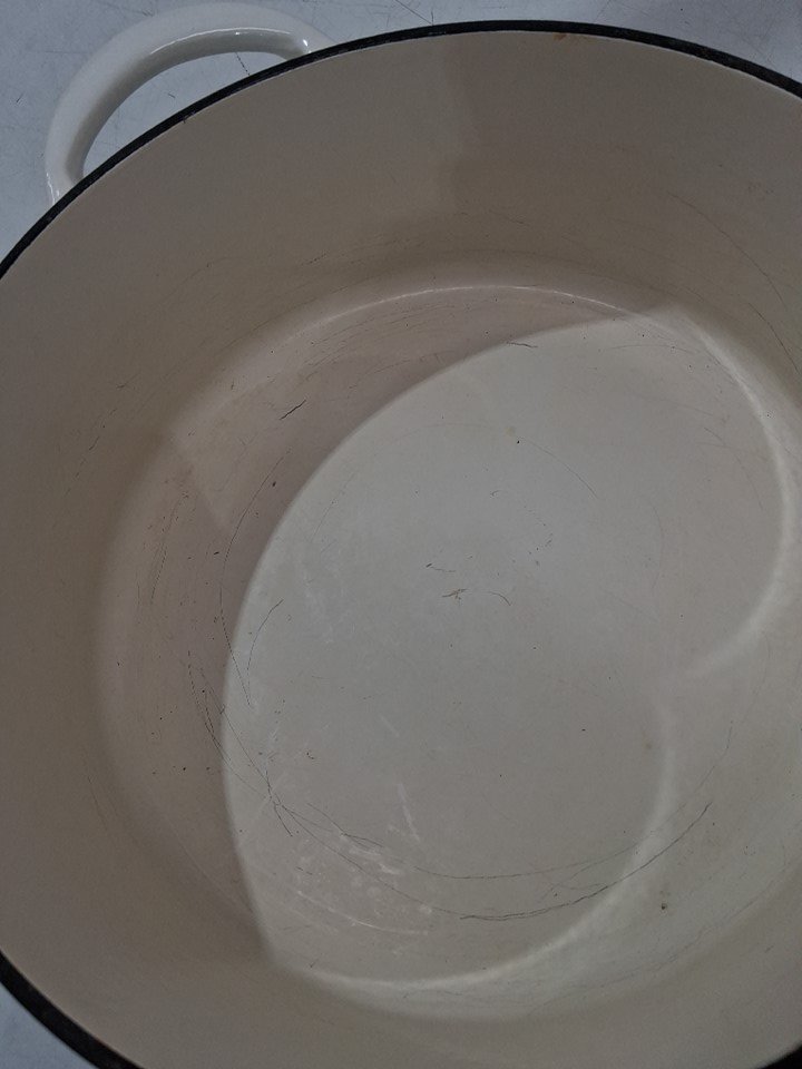 scratch marks on bottom of dutch oven. chip in enamel. cooked residue on bottoms of pots.