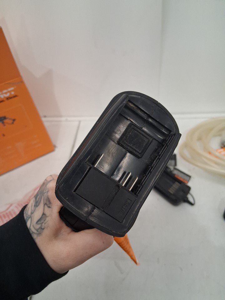 Hydroshot has visible dirt discoloration on it and on hose. Battery is missing and unable to test