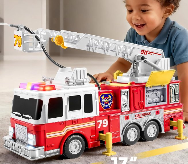 joyin vroomix toddler firetruck toy with 33" ladder - lights and sprinkler pump fire truck toy