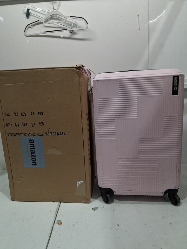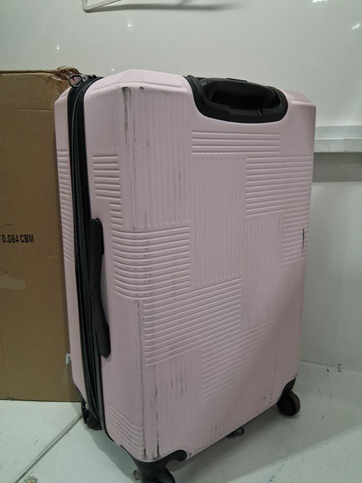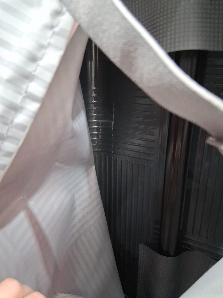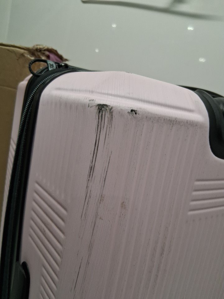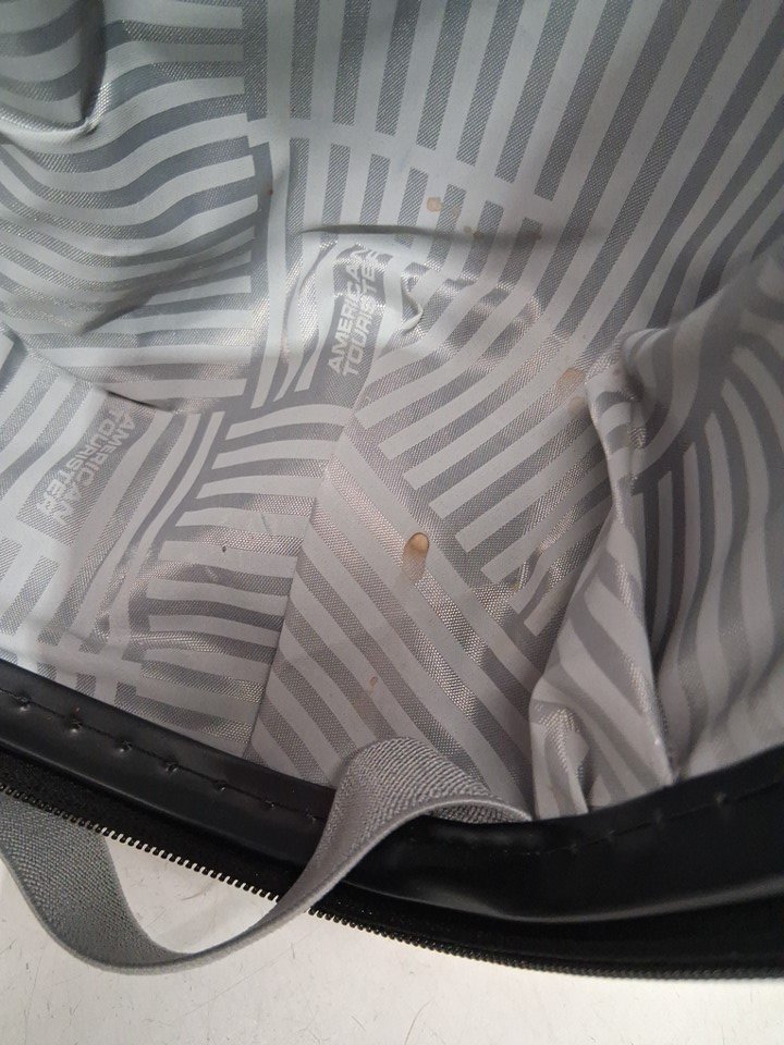 Surface of the item is scuffed and has a cut on the back. The inside has some minor spots/stains.