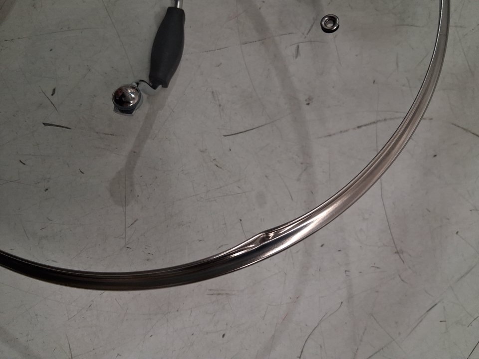 Please note the lid has a dent in it which causes it to not sit properly on top of the pan and the pan appears not be slightly misshapen, not making a circle, see photos.