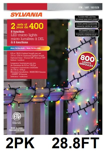 2PK Sylvania 400 Micro LED Christmas Lights - 28.8FT - MULTI-COLOUR (MODEL: 1851528)