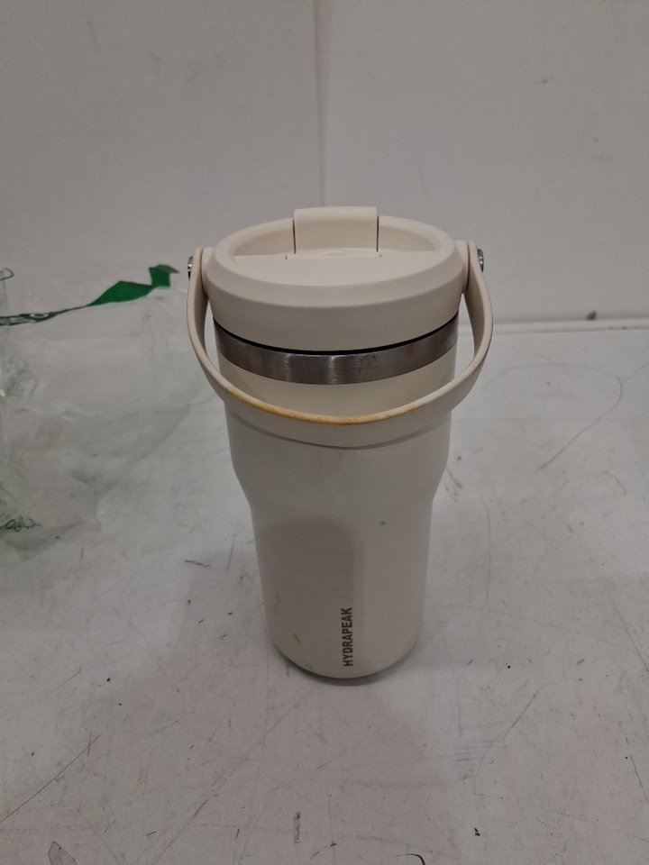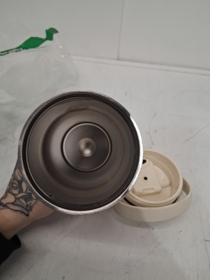 Outside tumbler, has scuff marks and handle has sticky residue on it, inside has water spots