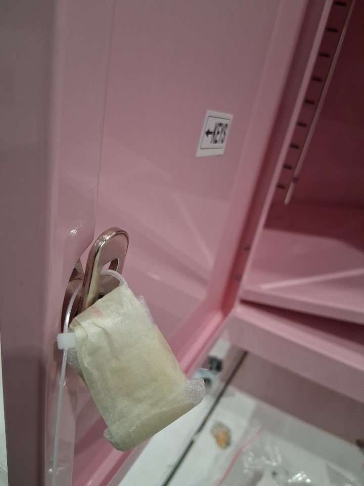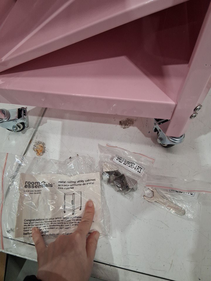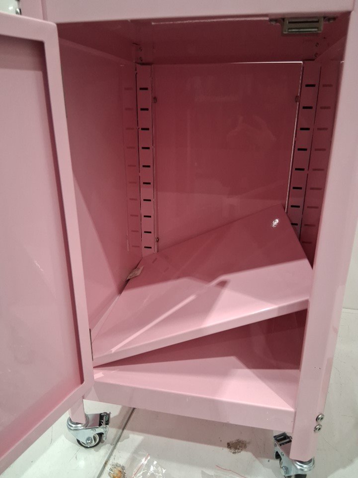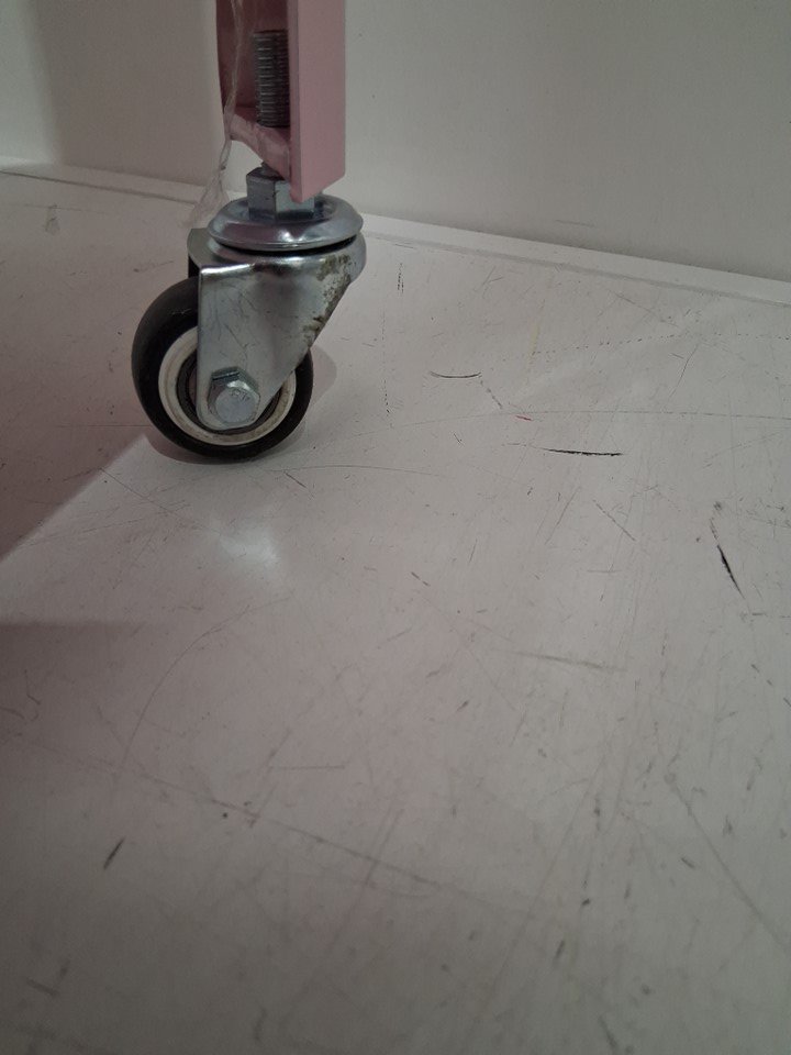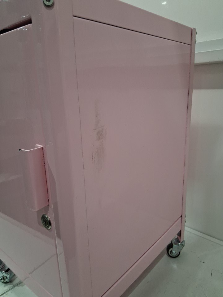 The surface is scuffed/scratched due to lack of packaging. Was assembled. Door is a bit loose.