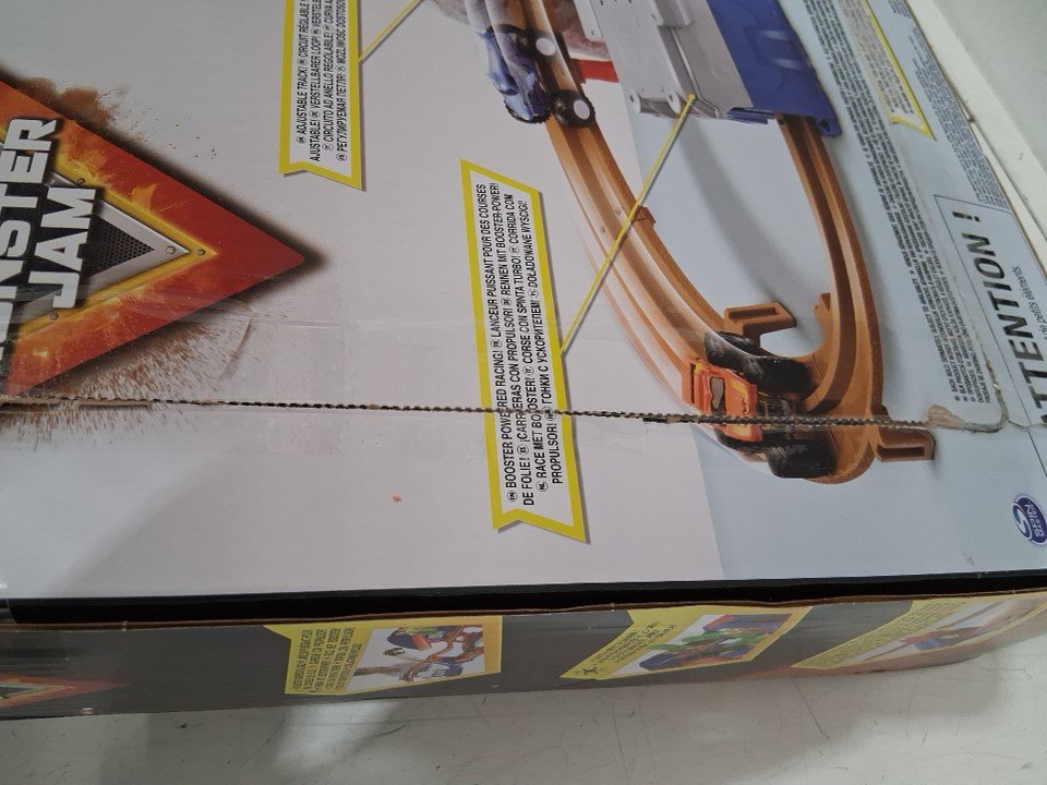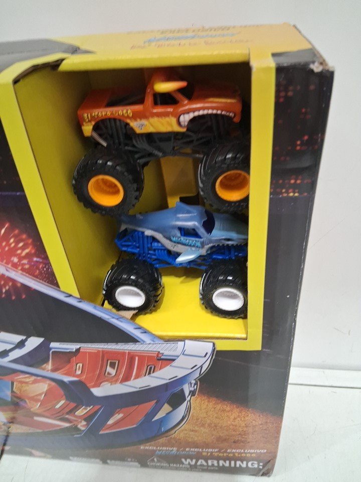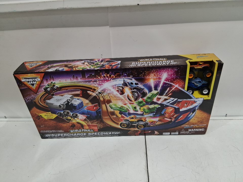 kids Monster Jam Supercharge Speedway Light Up World Finals Track Playset with Megalodon and El Toro Loco Die-Cast Monster Trucks