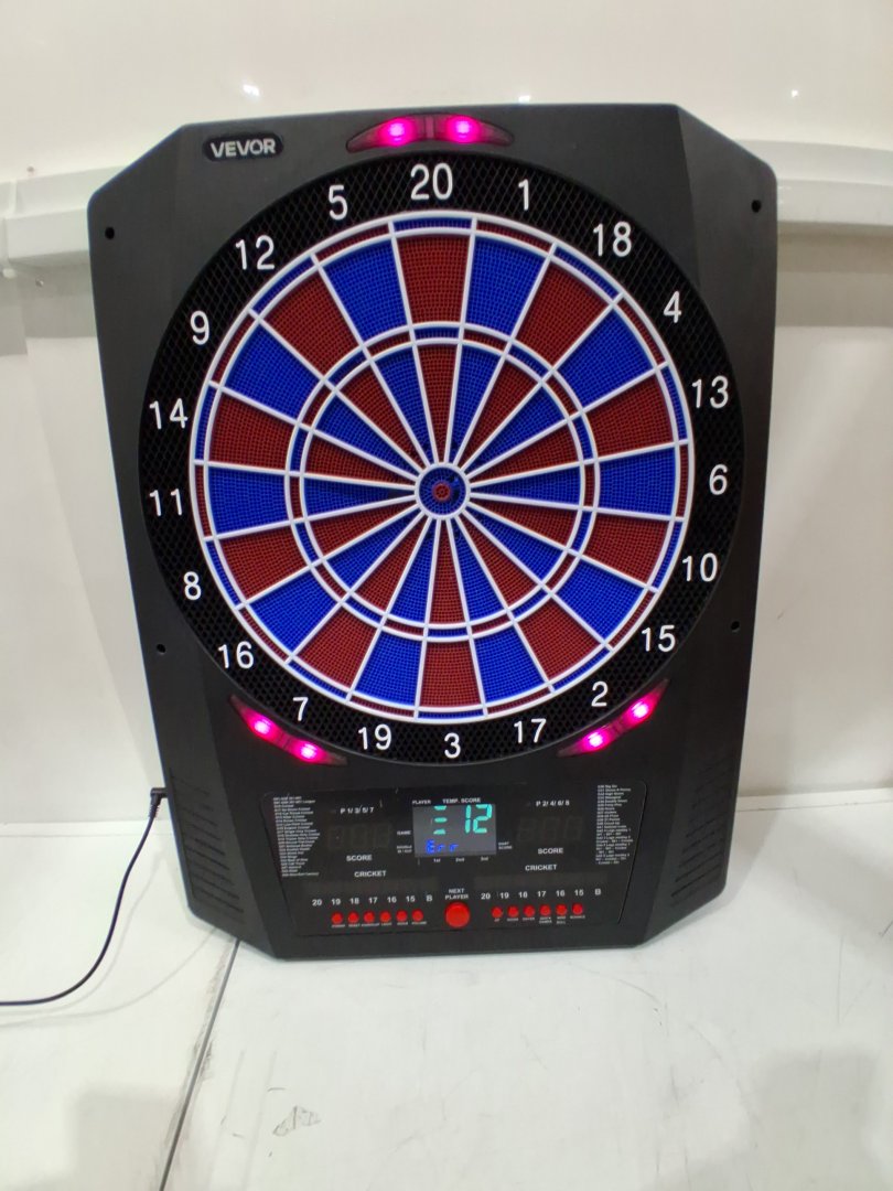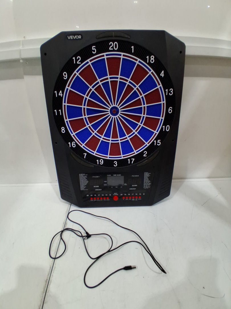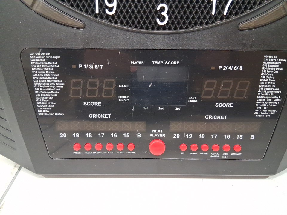 Item shows signs of previous use such as impact distress on board, scratches on screen, and mild white dust on back of item. Item does NOT include darts. Item tested for power.