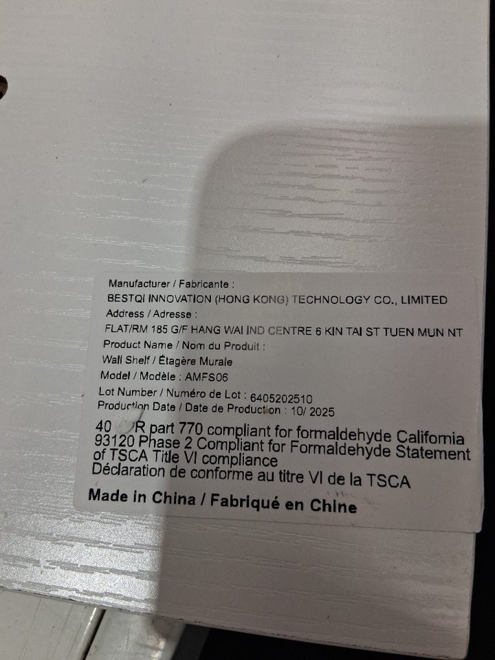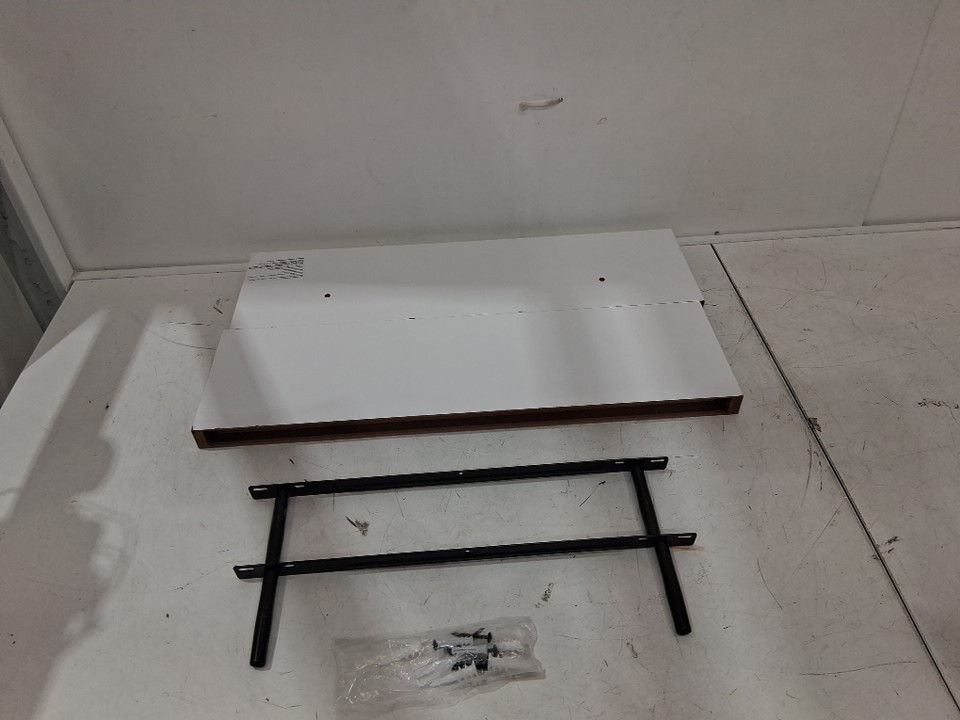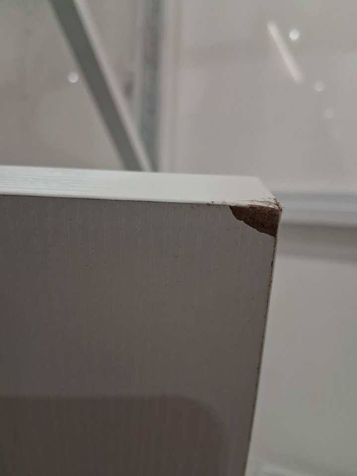 please note that one of the corners of the wooden shelf is damaged and chipped out and missing hardware for one of the shelf (see photos).