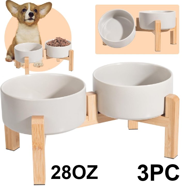 3PC Elevated Ceramic food and water Dog Bowl Set - 28 oz each Bowl - Small/Medium Dogs - (Model: QE1119-G-M2)