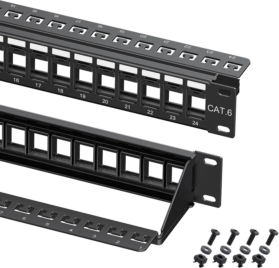 Cable Matters Rackmount or Wall Mount 1U 24 Port Keystone Patch Panel with Support Bar - black