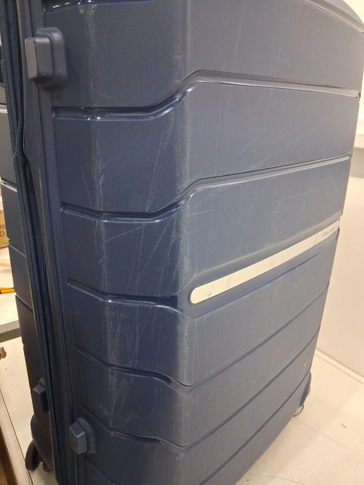 Suitcase is covered in scratches and scuff marks