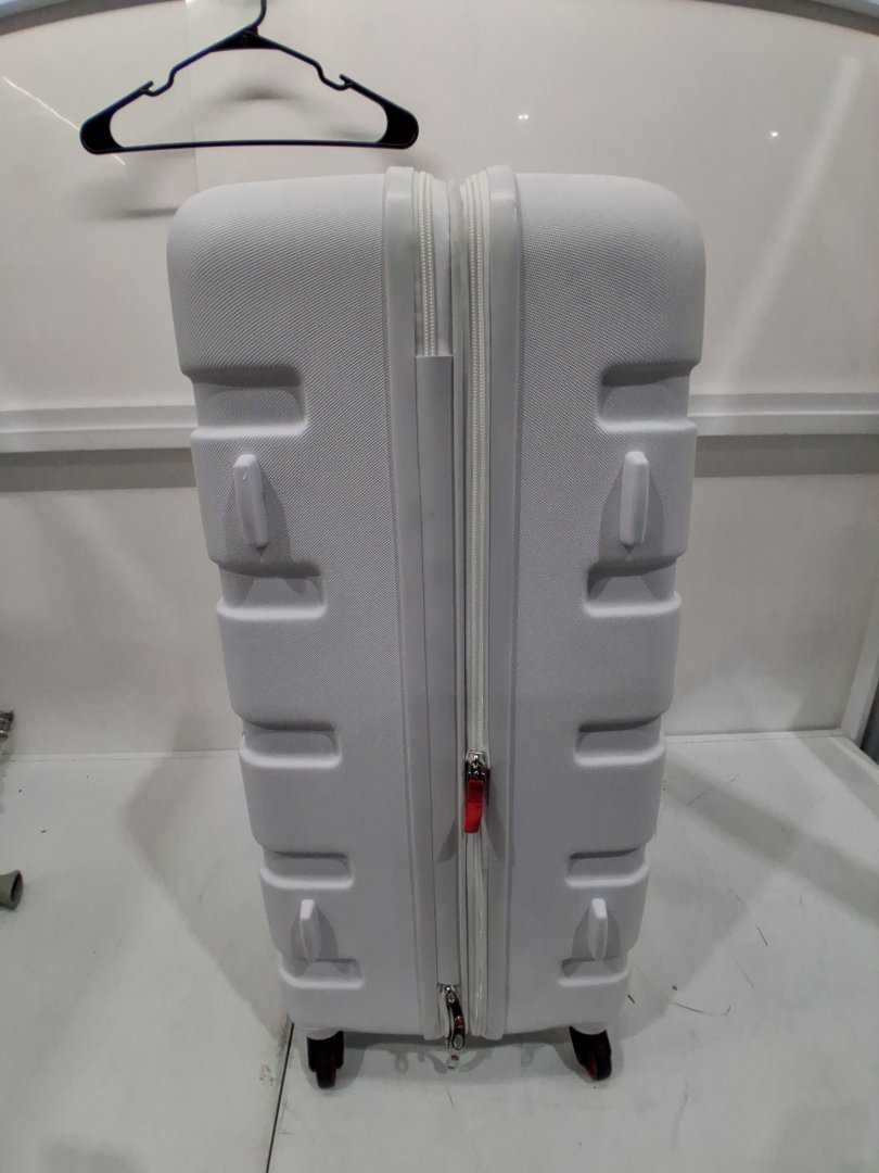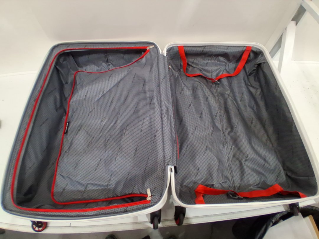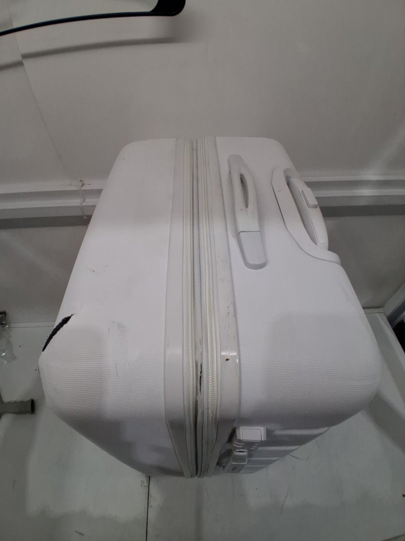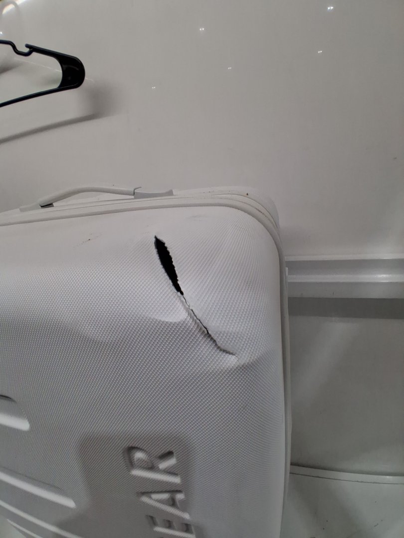 Item shows signs of distress such as black scuffs, mild dents, dirt/dust on surface, mild pin holes on inside fabric and a damaged corner on front side of luggage. Item still has tags attached, mostly distressed from shipping.