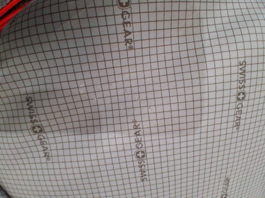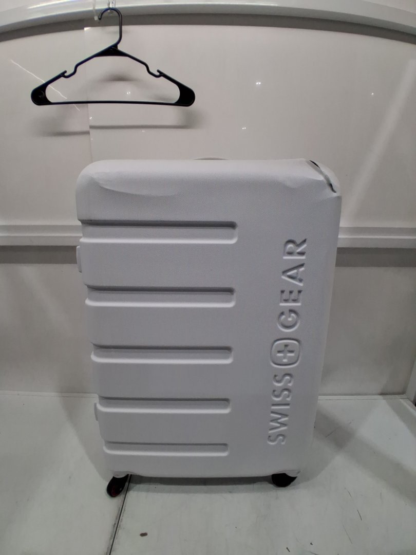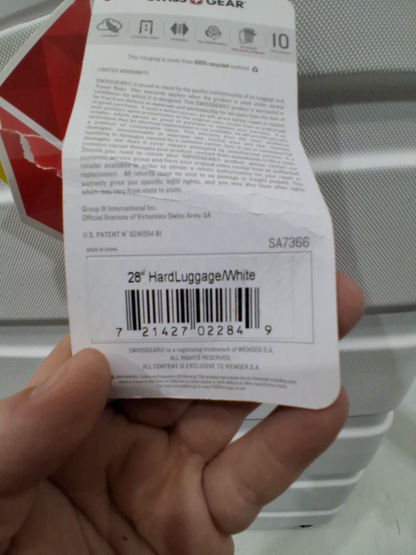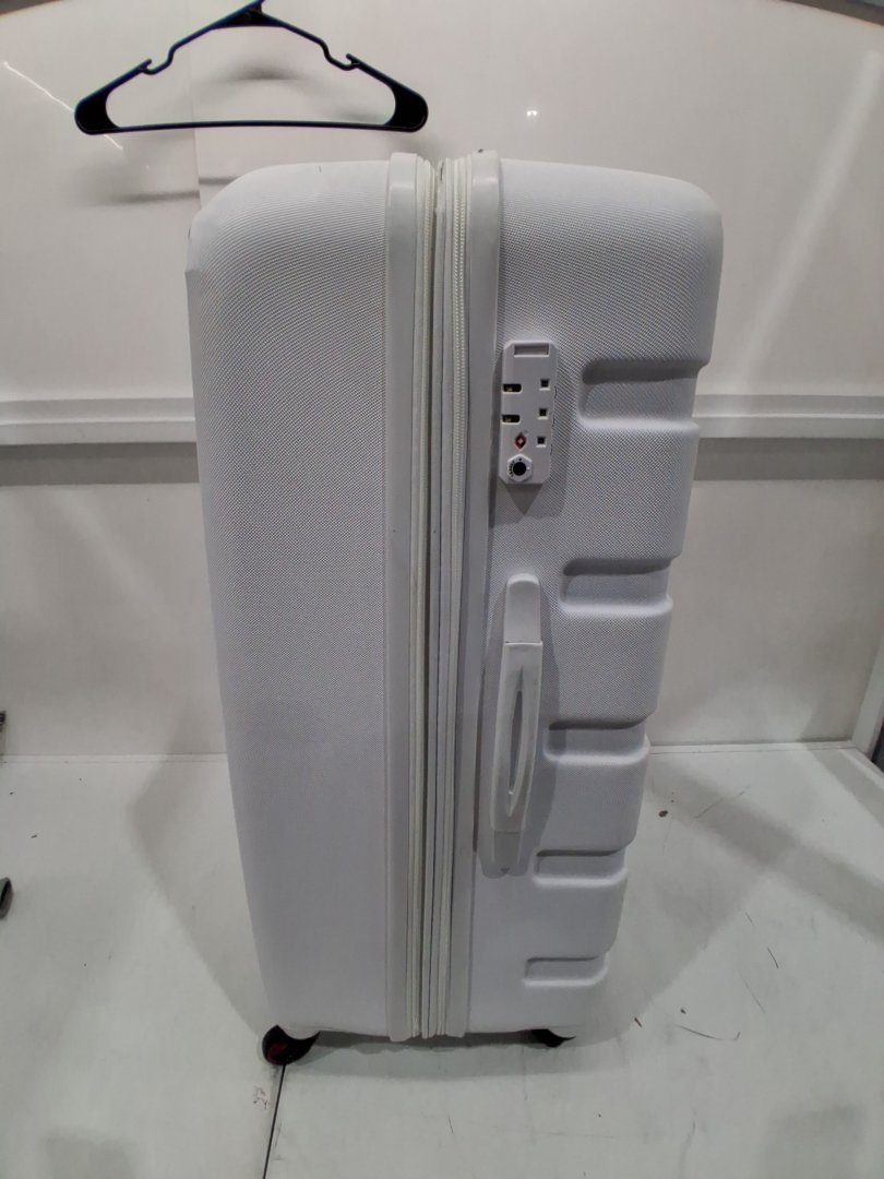 Item shows signs of distress such as black scuffs, mild dents, dirt/dust on surface, mild pin holes on inside fabric and a damaged corner on front side of luggage. Item still has tags attached, mostly distressed from shipping.