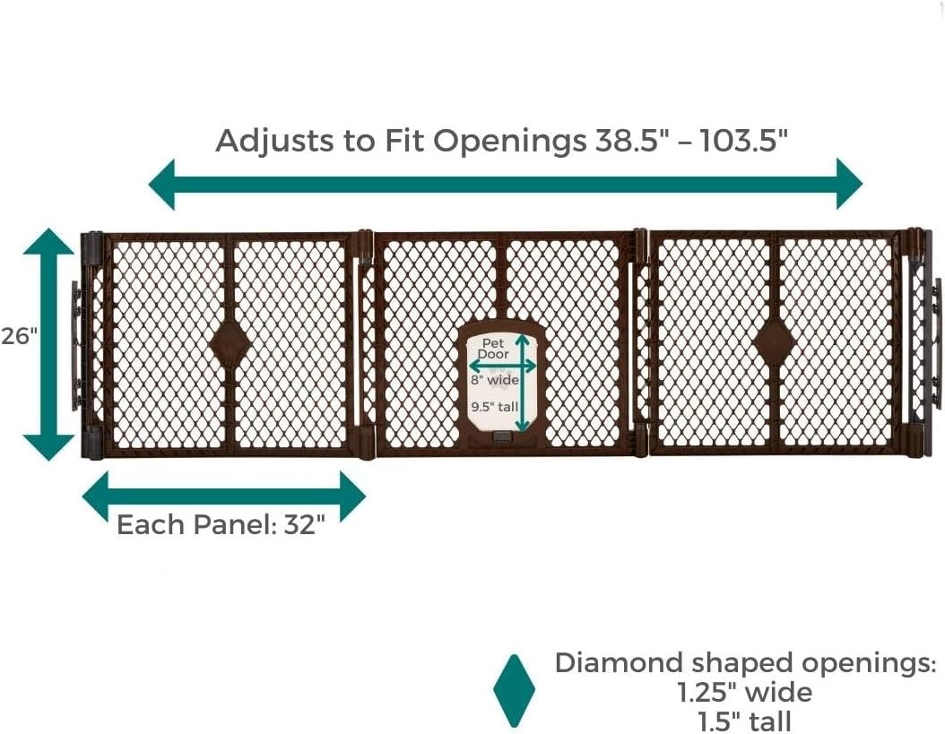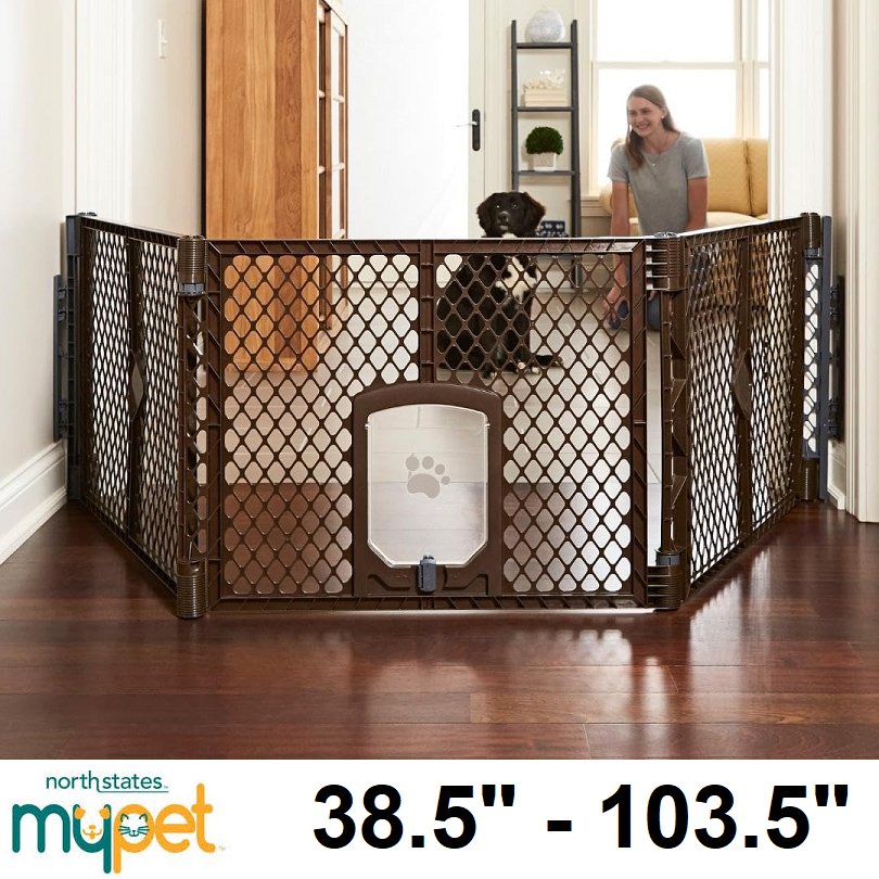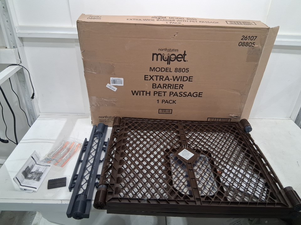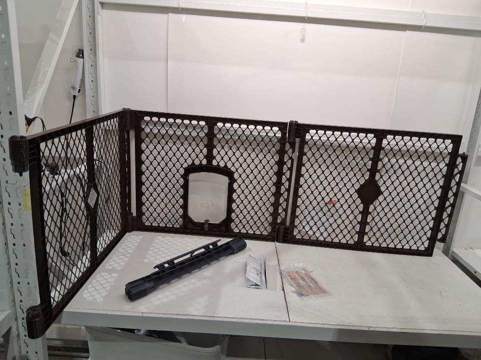 Please note that there is a small piece broken off of one of the panels, but it does not appear to affect function and the gate otherwise appears new (see photos)