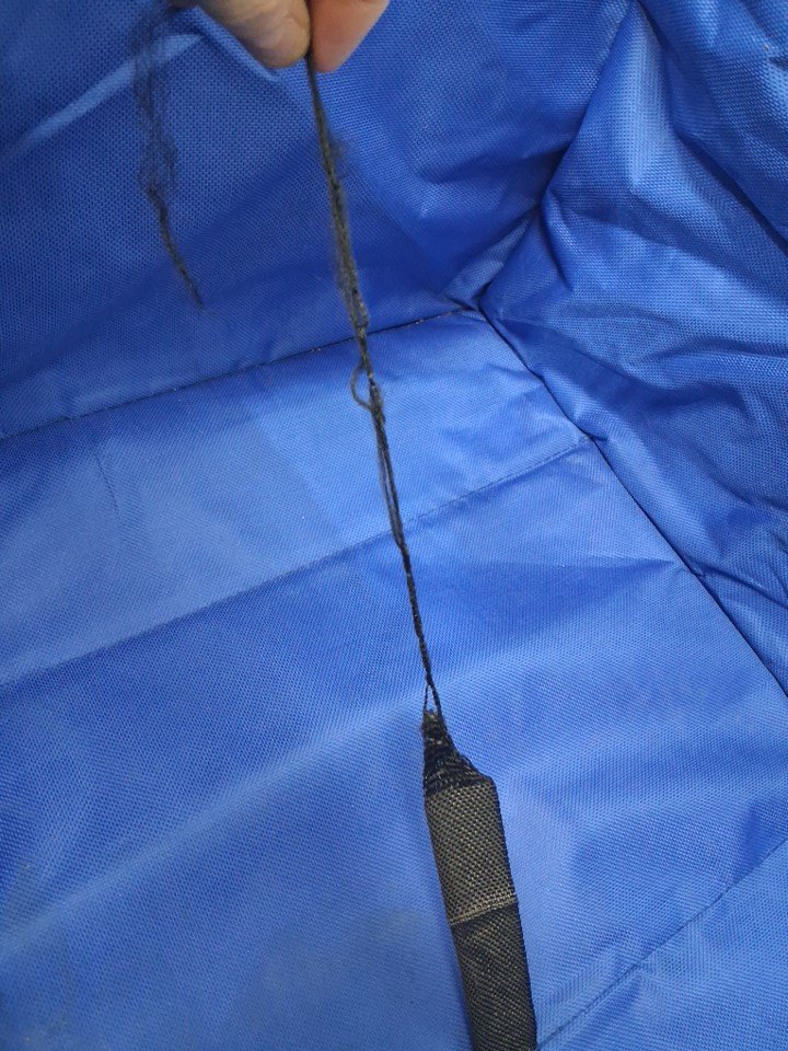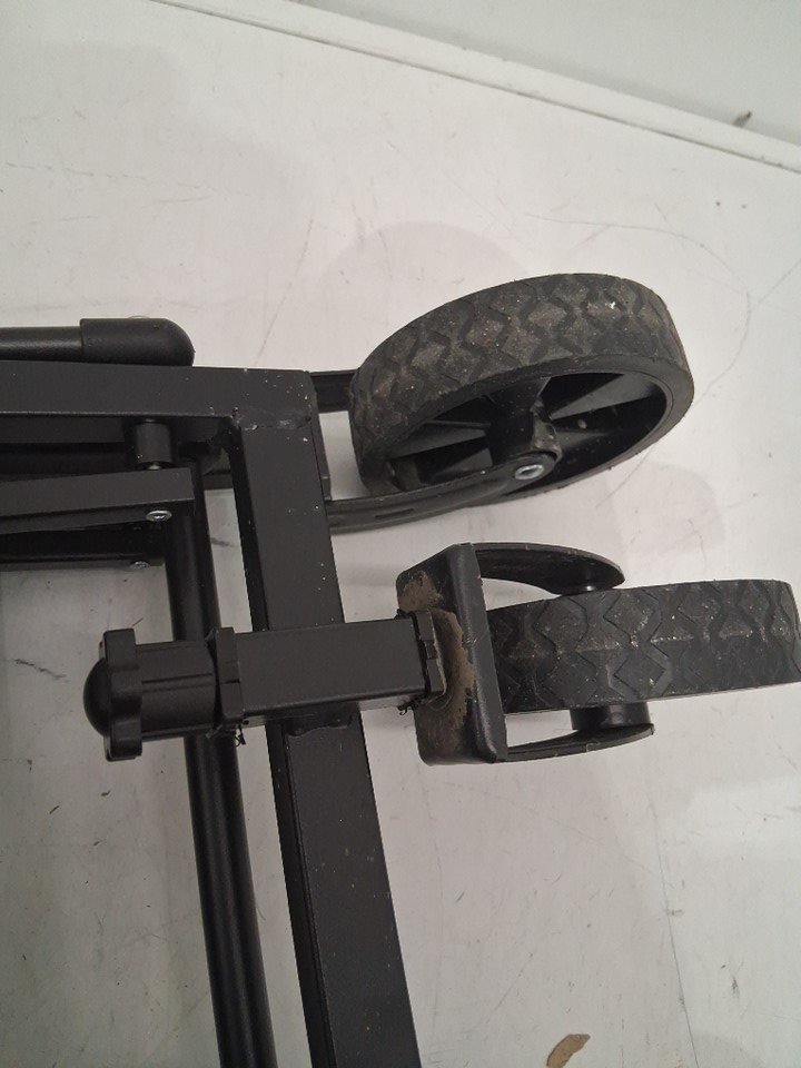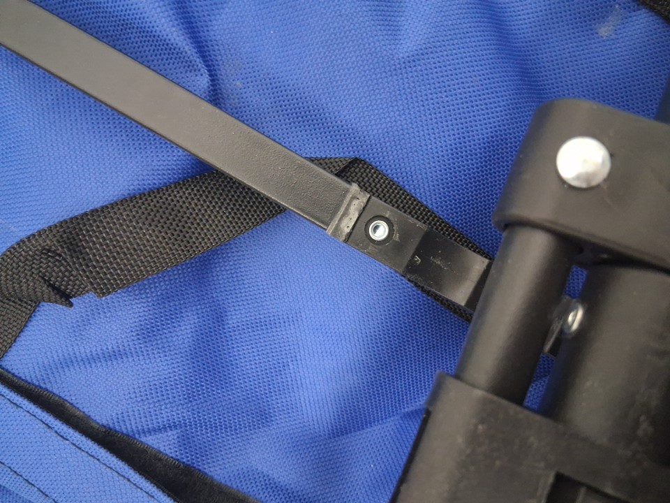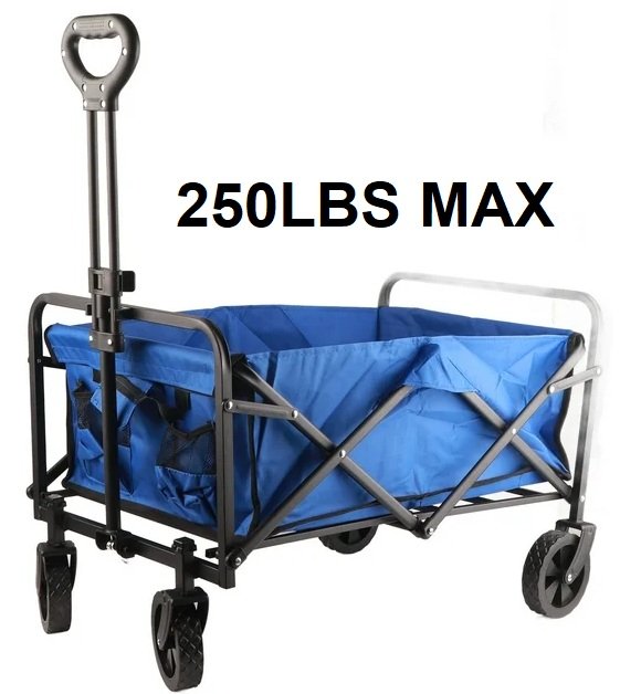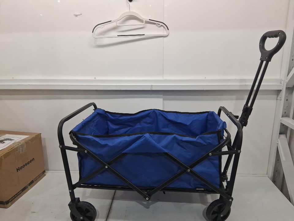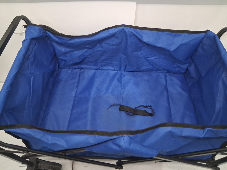 Wheels have visible dirt on them, inside wagon bottom has light staining on fabric, loop on inside is distressed and clip to hold handle is broken