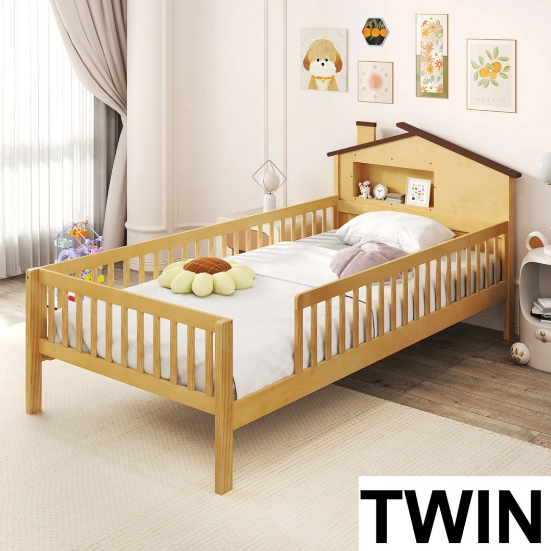 Montessori Bed with House-Shaped Headboard and Built-in Storage Shelf - Twin - natural wood - (model: hu11001na-t)