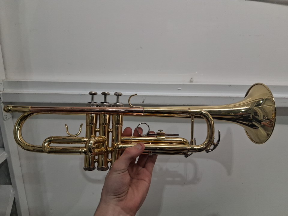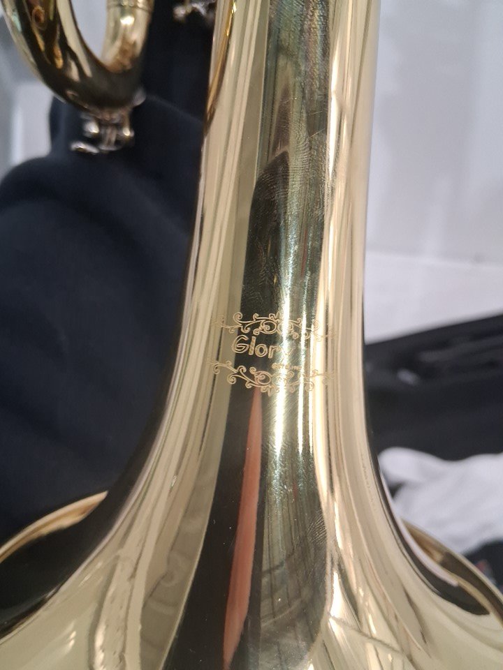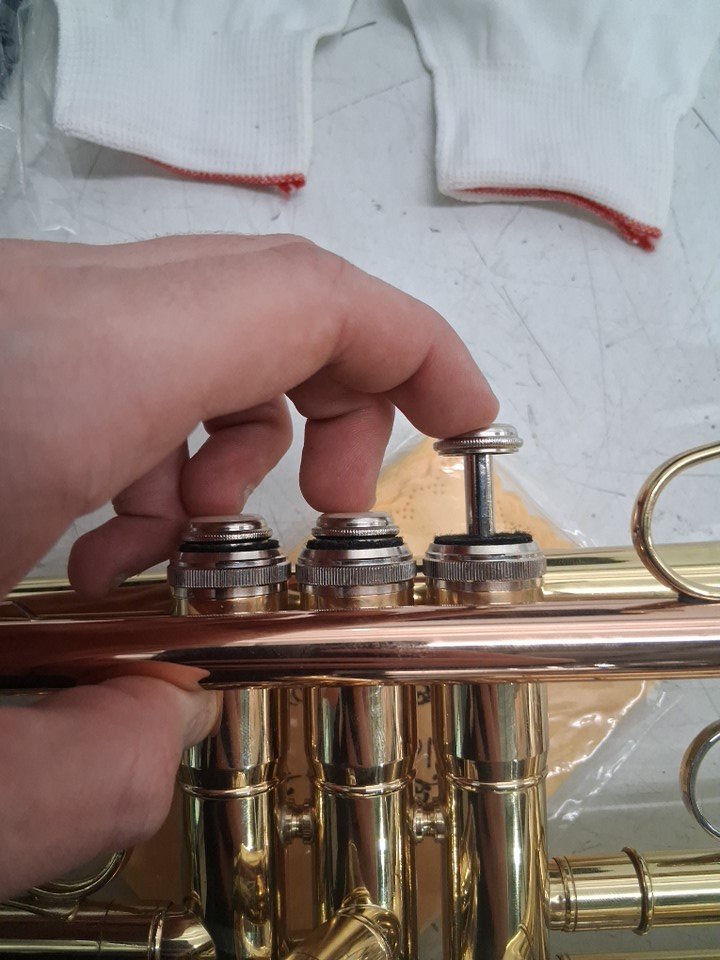 The bell of the trumpet has stains from previous use and it will need to be cleaned. *Also, one of the trumpets buttons is also seized and it will need to be fixed before use*.