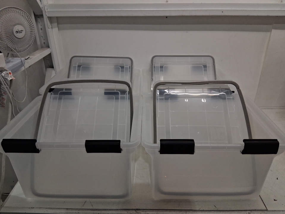 Please note one of the lids corners is broken off and another lid is split down the side. One of the bins top corners is cracked, see photos.