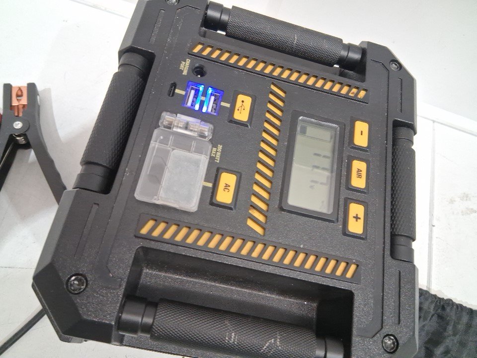 item has light scuffs/marks throughout as well as signs of use on the jumper cable clips (see photos), item was tested for basic power only, LED light does not seem to function more than a flicker