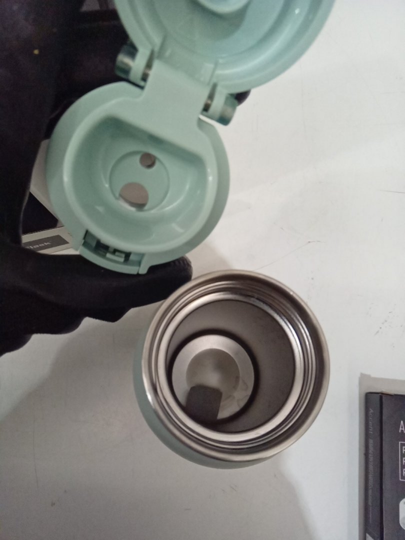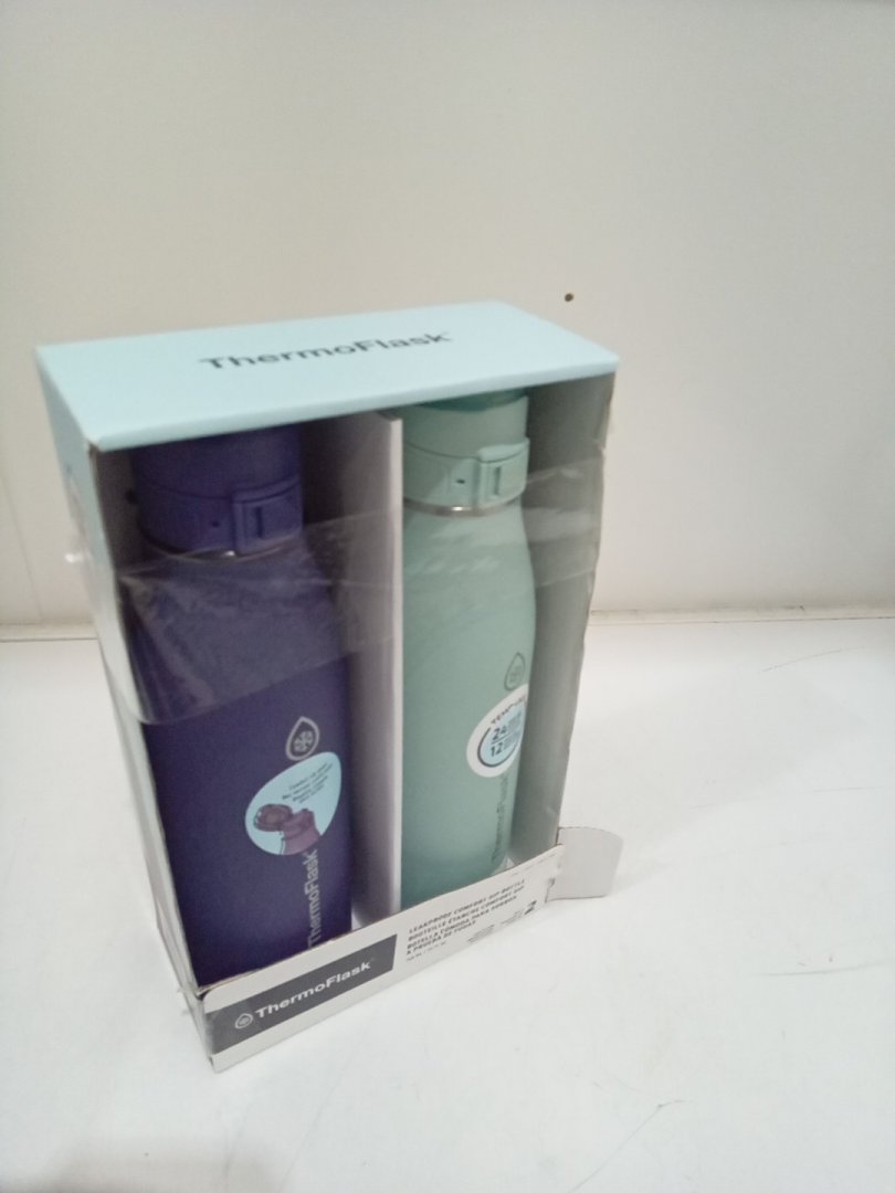 Green flask appears to have been previously used with some water stains inside, and the blue one remains sealed in packaging. Please see photos.