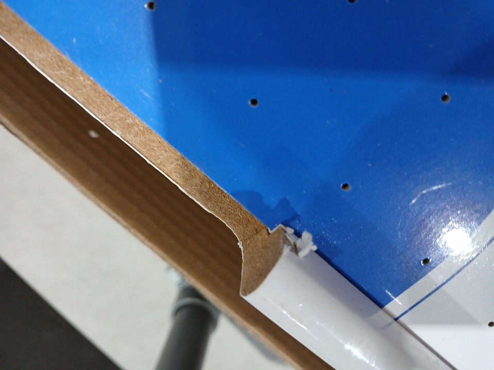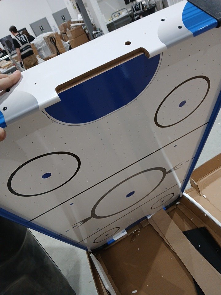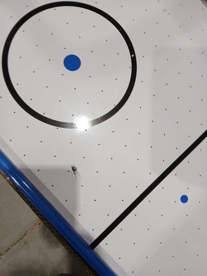 Please note there is a minor puncture on the tabletop, as well as a bit of peeling at the goalie post. See photos.