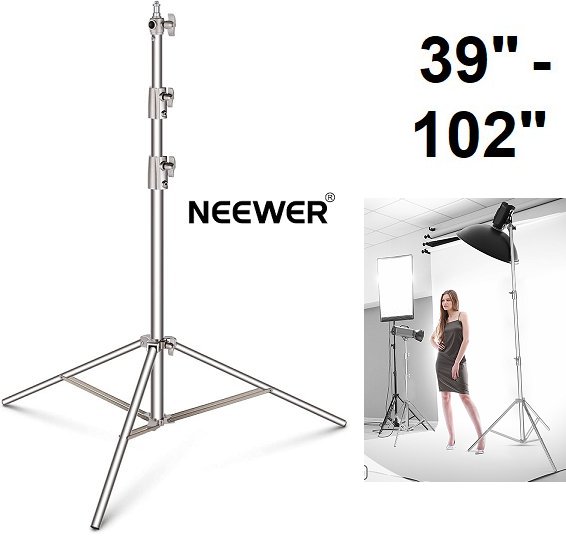NEEWER STAINLESS STEEL SPRING CUSHIONED HEAVY DUTY TRIPOD STAND WITH UNIVERSAL SCREW ADAPTER (1/4" - 3/8") - EXTENDS TO 102" - SILVER (MODEL: 10089813)