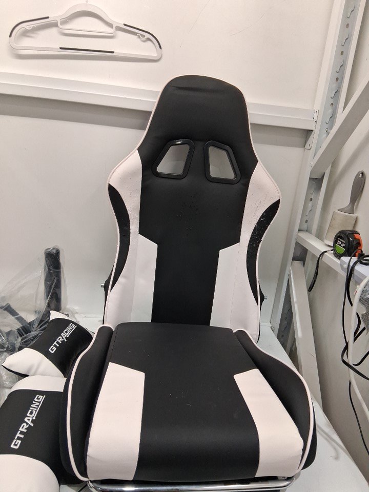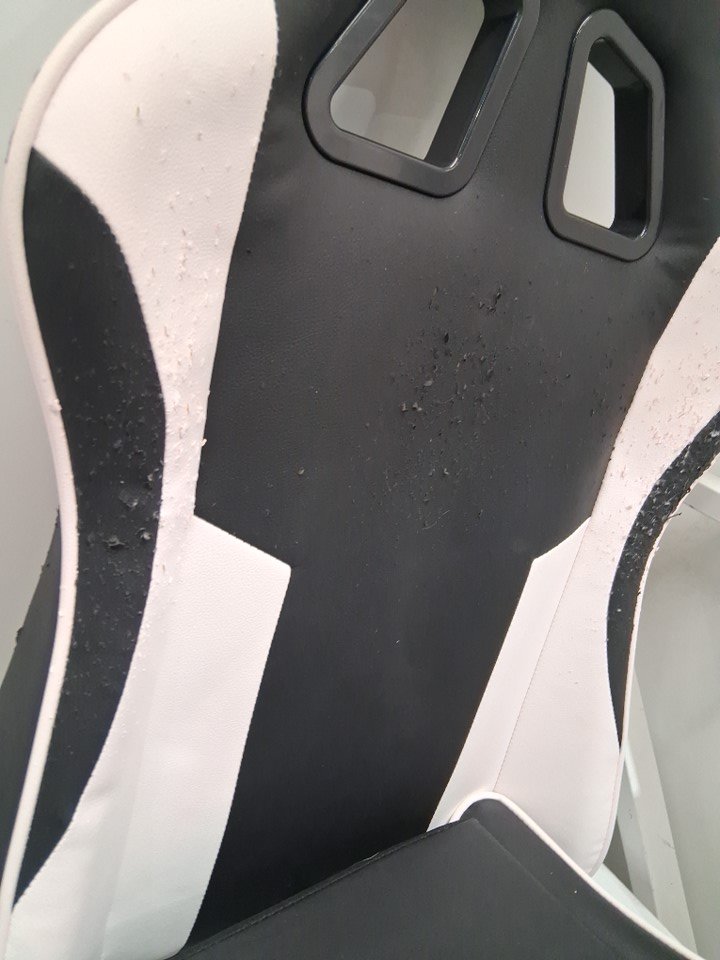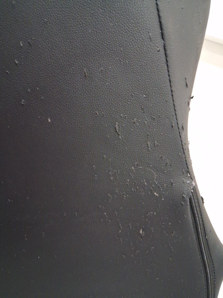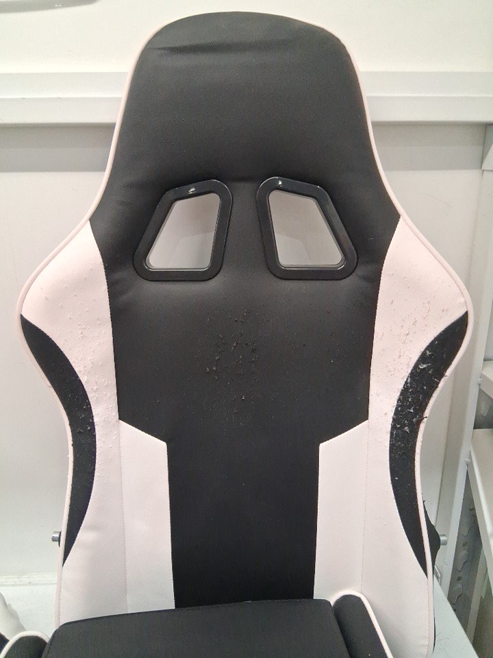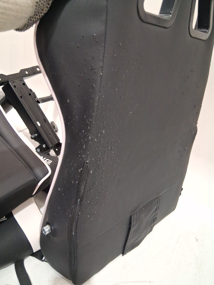 The upholstery of the chair is peeling and flaking both at the front and back, see photos for reference. Item has some scuffing/scratches and marks from previous installation. Some of the hardware may be missing.