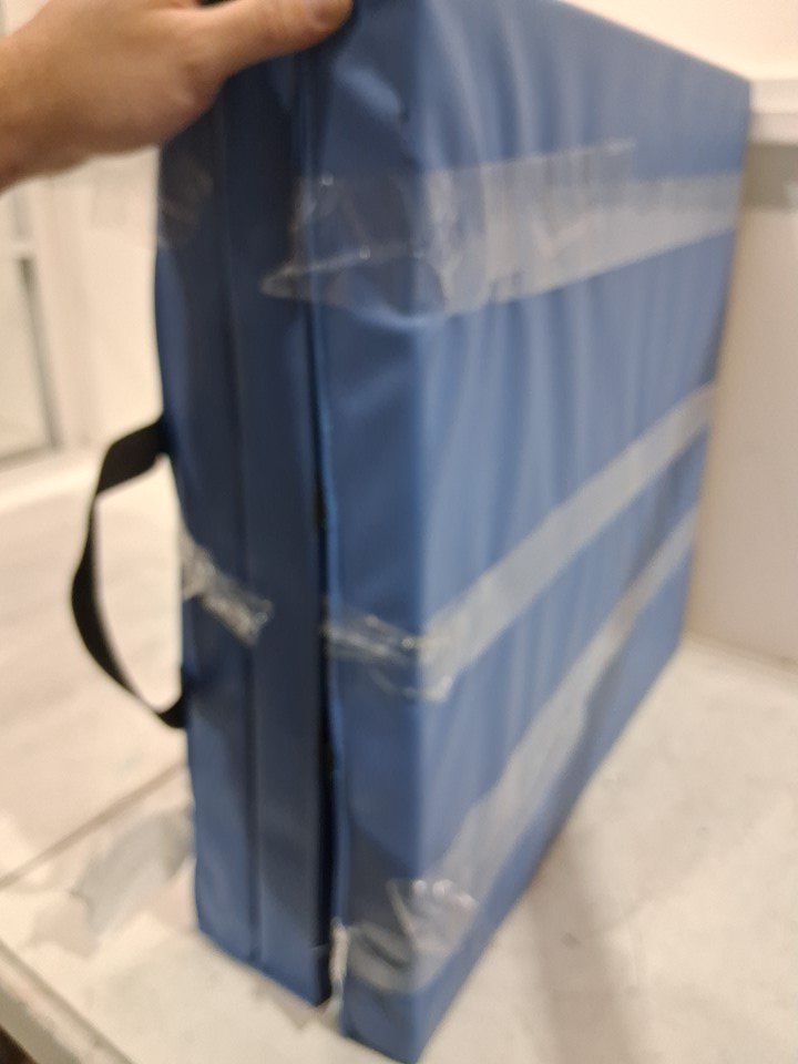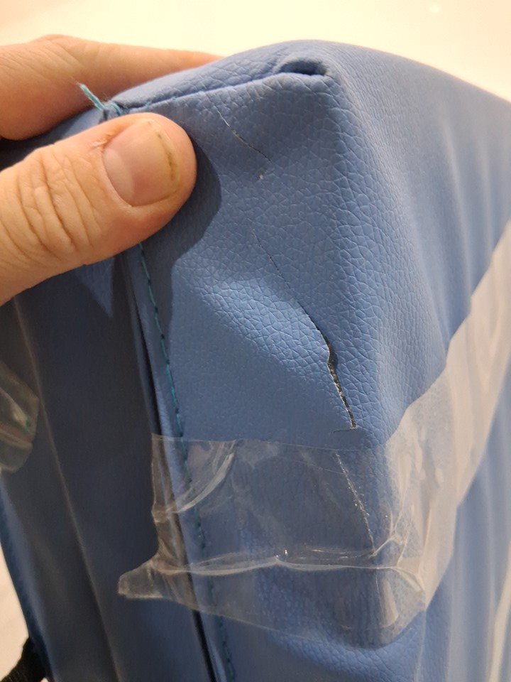there is a tear in the product, and also some tape which is stuck to the surface of the product.