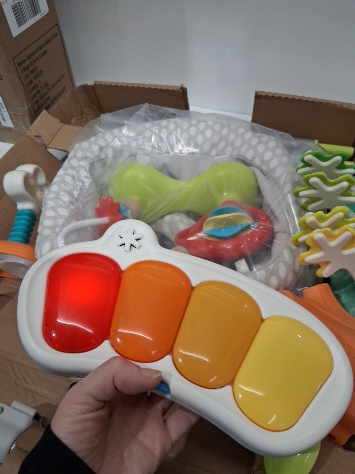 Tested piano for power/sound. The surface of the pain part has some blue markings and toy appear faded. Missing bowl attachment.