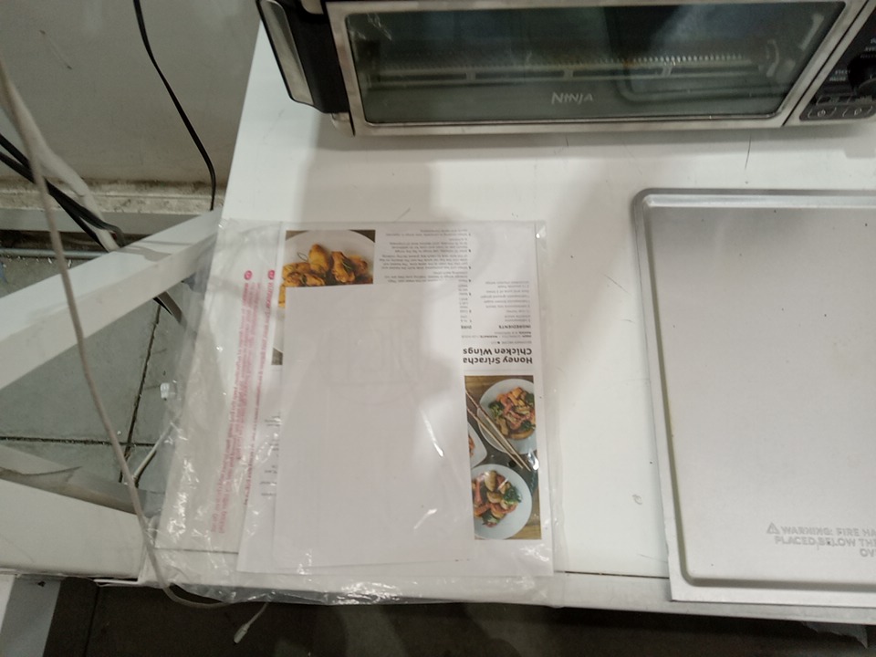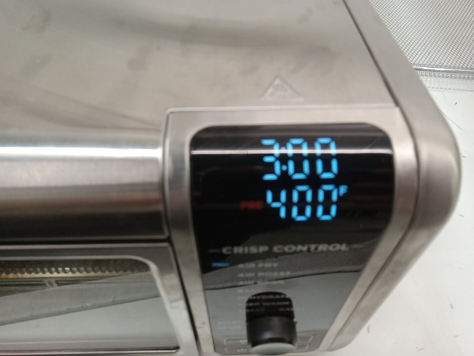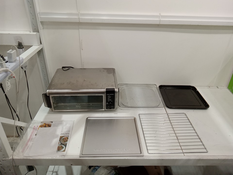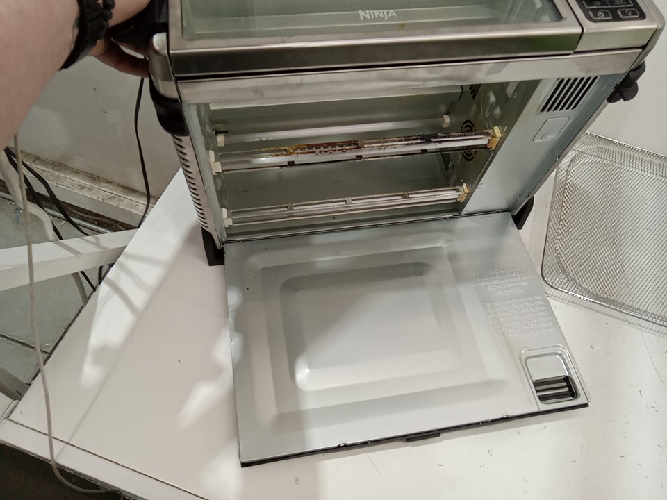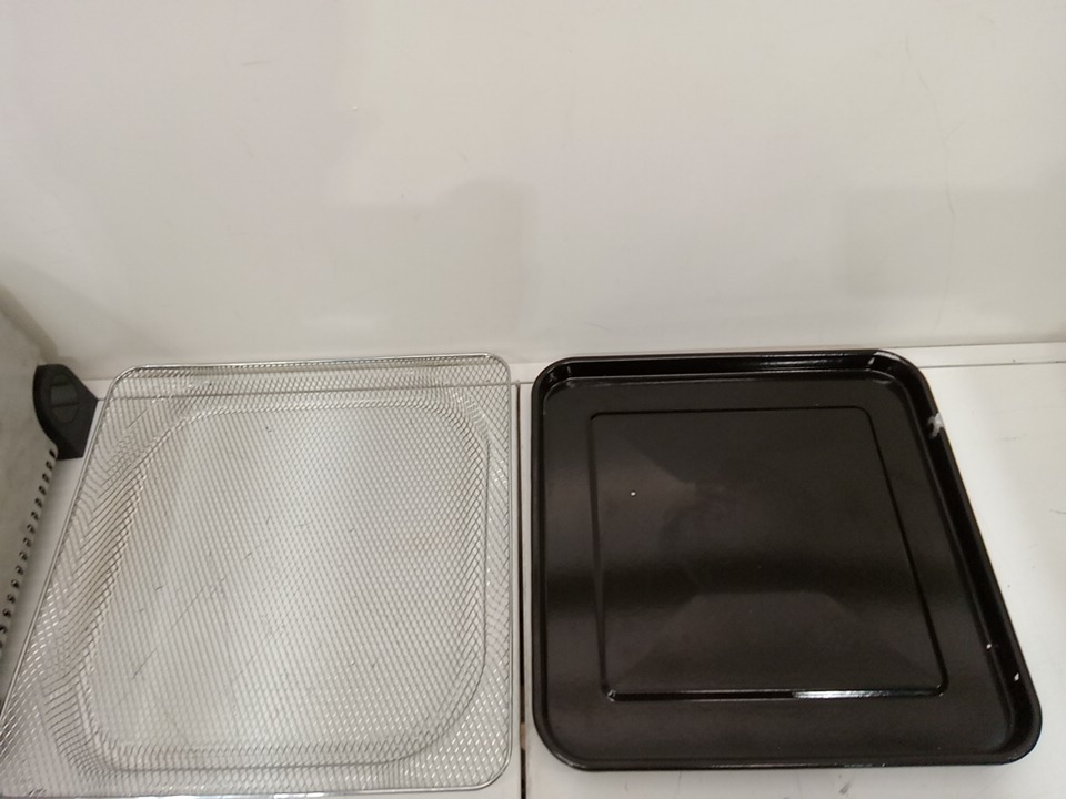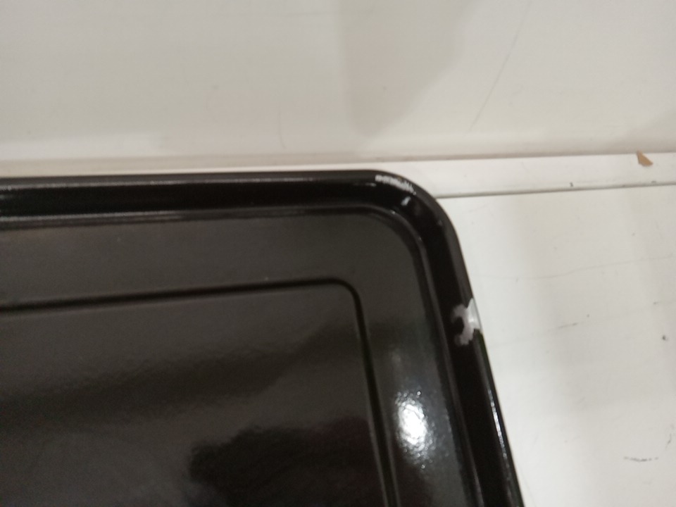 there are cooking and heat marks on the inner elements of the oven and there are some light chips to the coating on the roasting pan