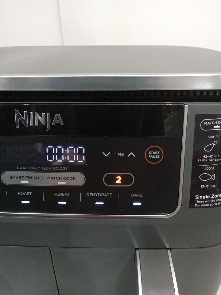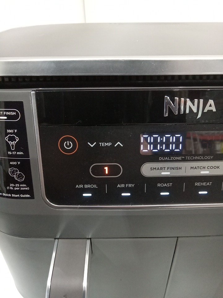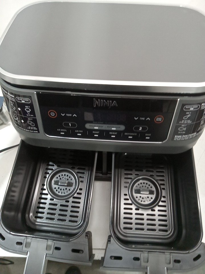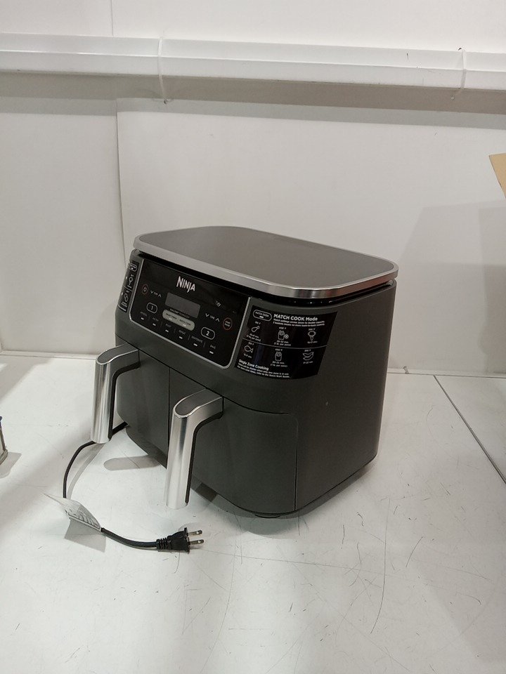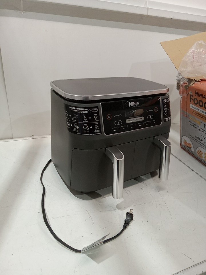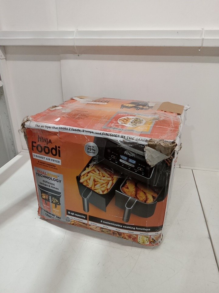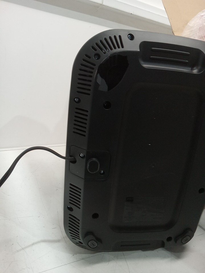 The one foot/corner of the air fryer is cracked off/open and another is cracked. Tested for power only.