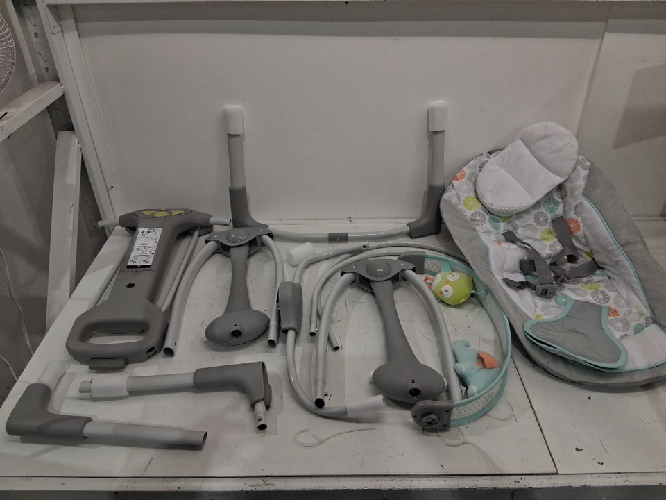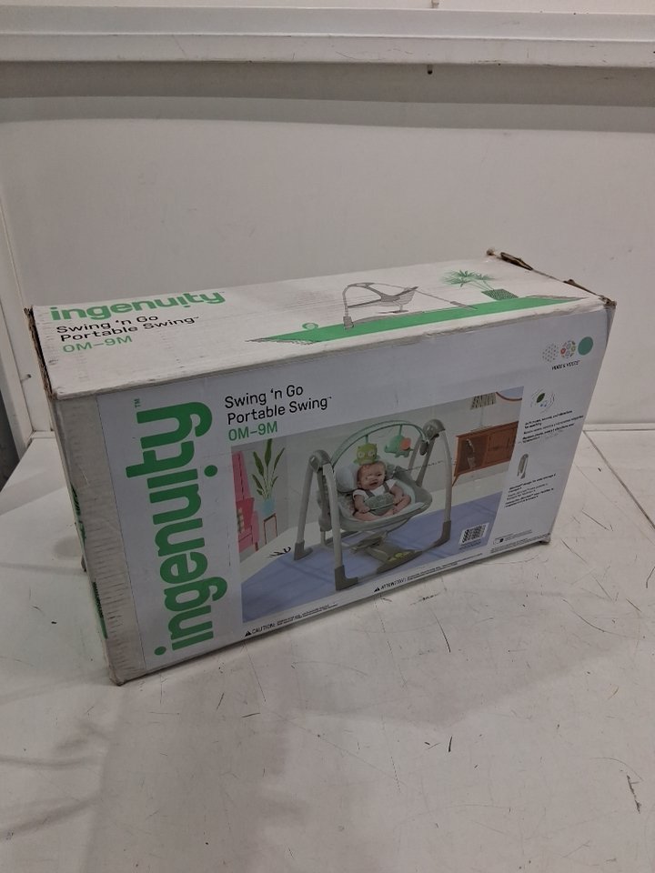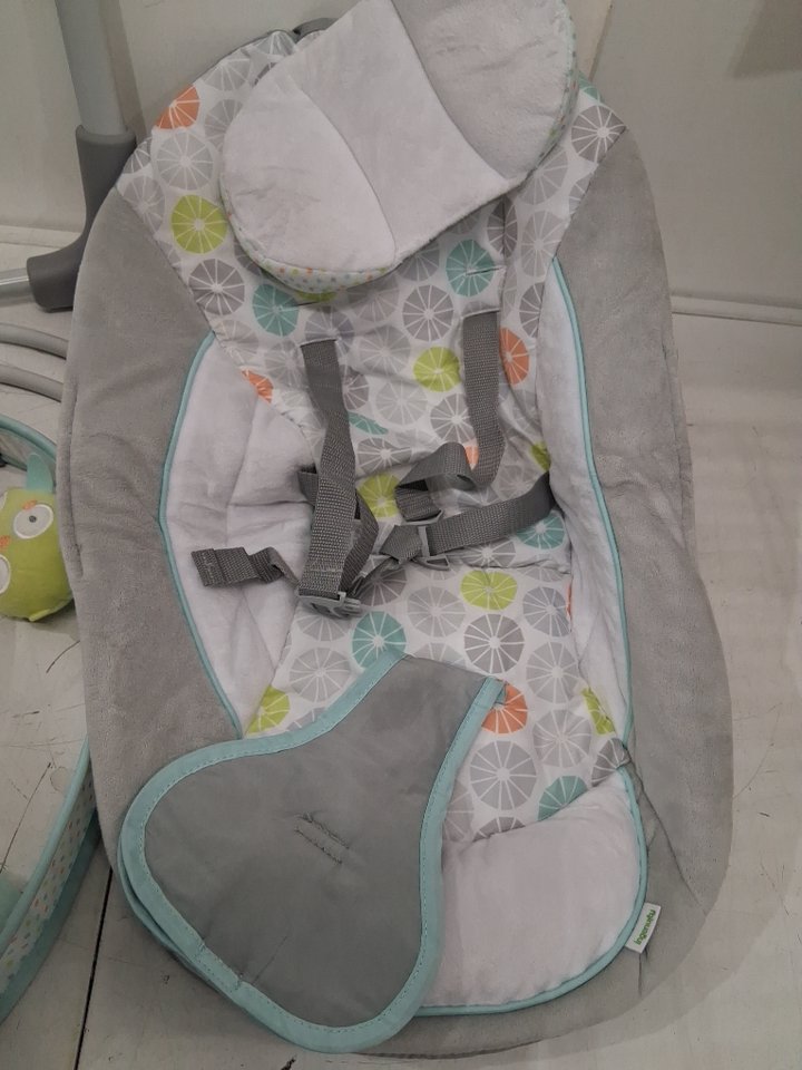 INGENUITY BRIGHT STARTS *battery operated* SWING 'N GO SWING WITH MULTIPLE SOUNDS/SWING SETTINGS, 20LBS CAPACITY - HUGS & HOOTS - GREY/TEAL/WHITE (MODEL: 10247-ES)