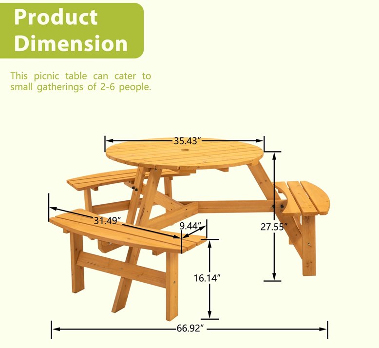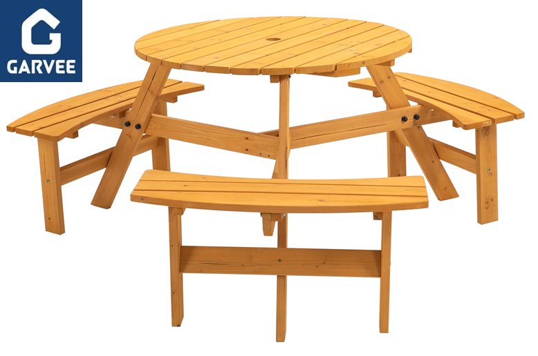 garvee round wooden picnic table with 3 benches - 66.92" x 27.55" - natural wood