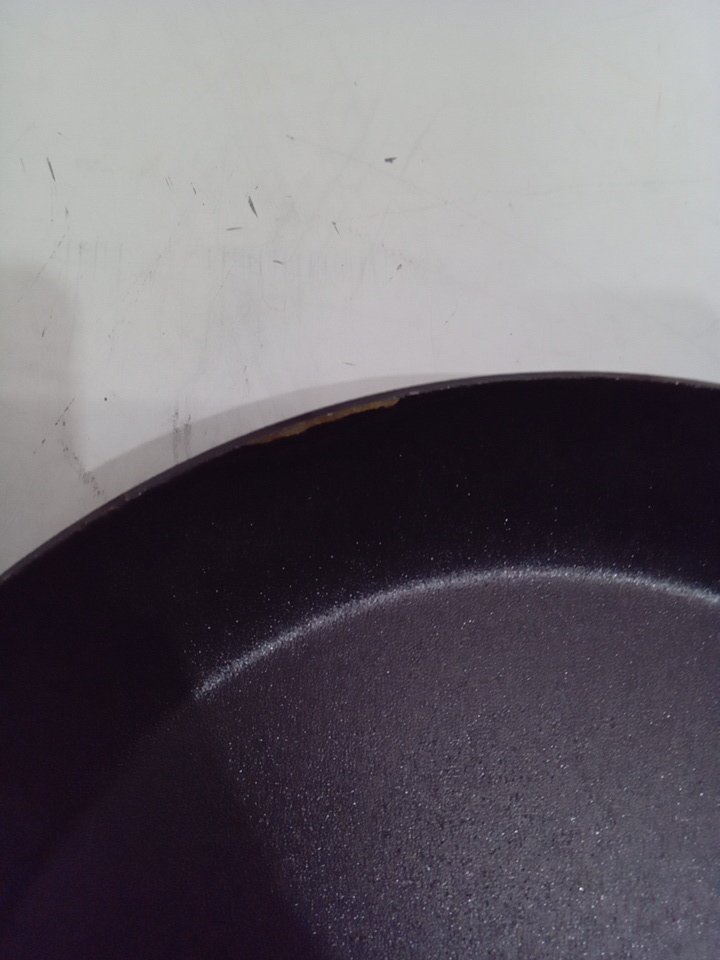appears to have a couple chips, one on the interior and one on the exterior of the pan (see photo)