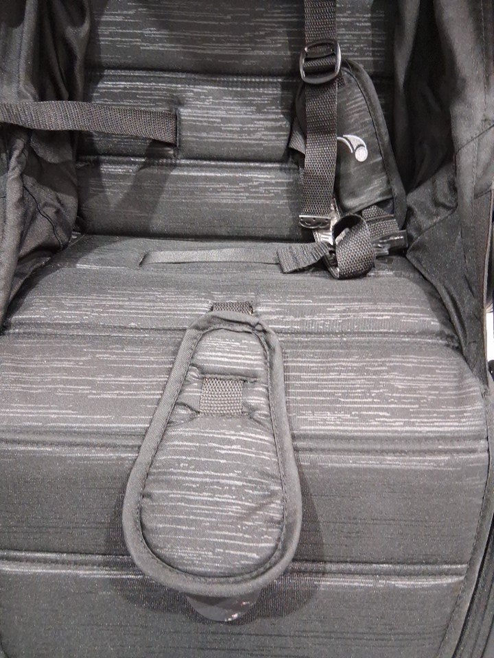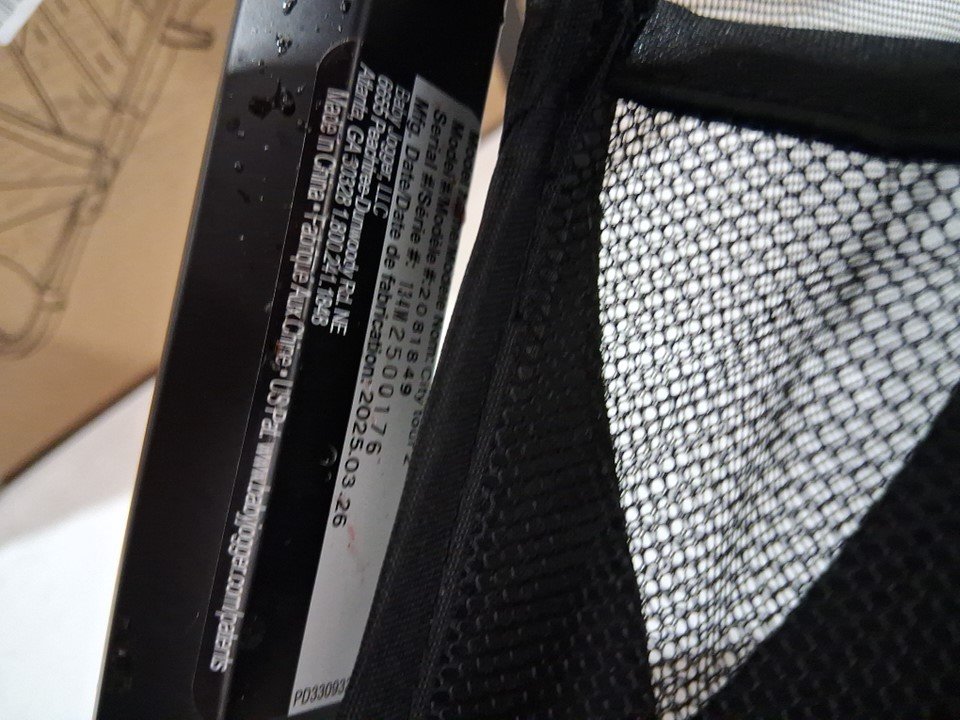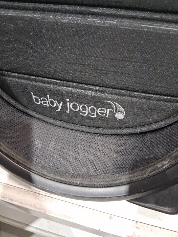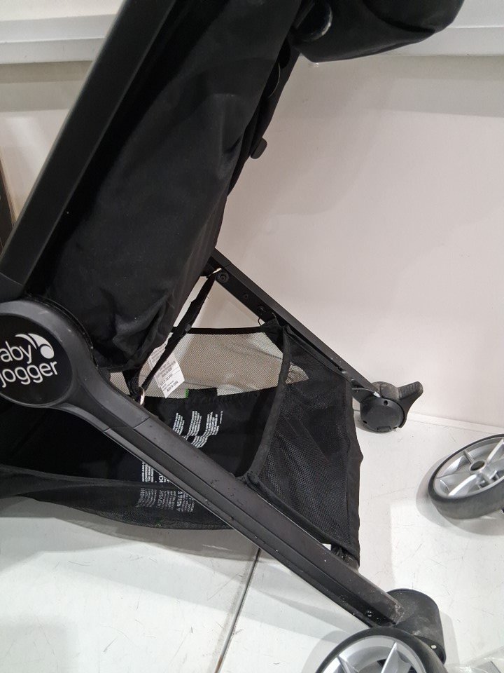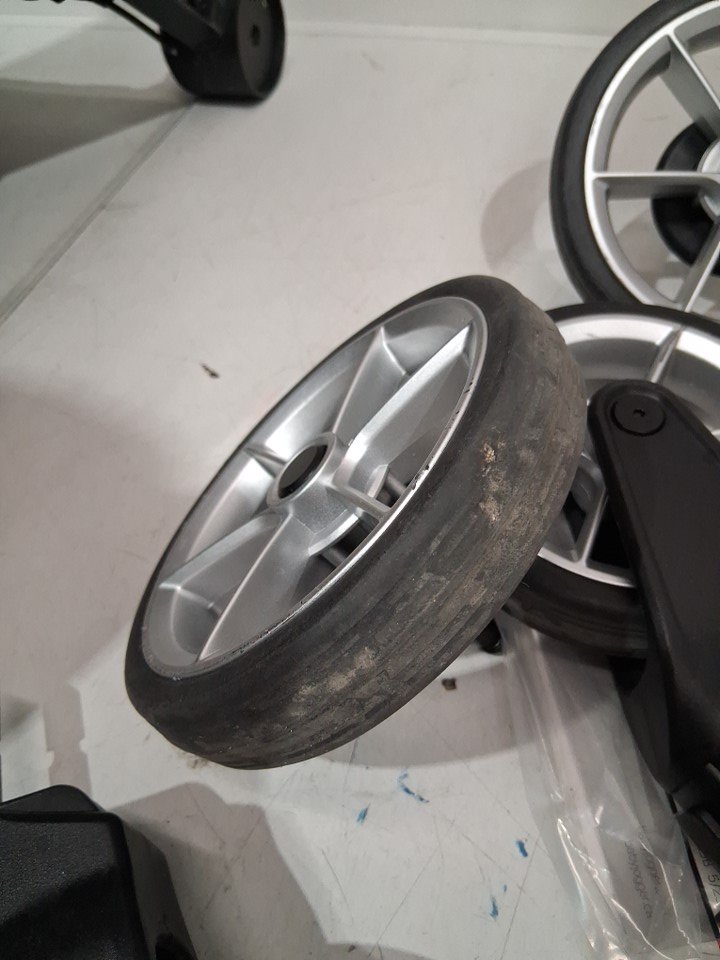 The wheels and base of the seat show wear. The poles have some residue.